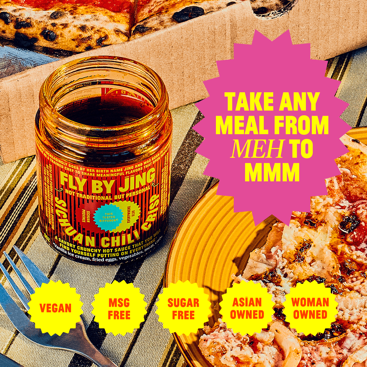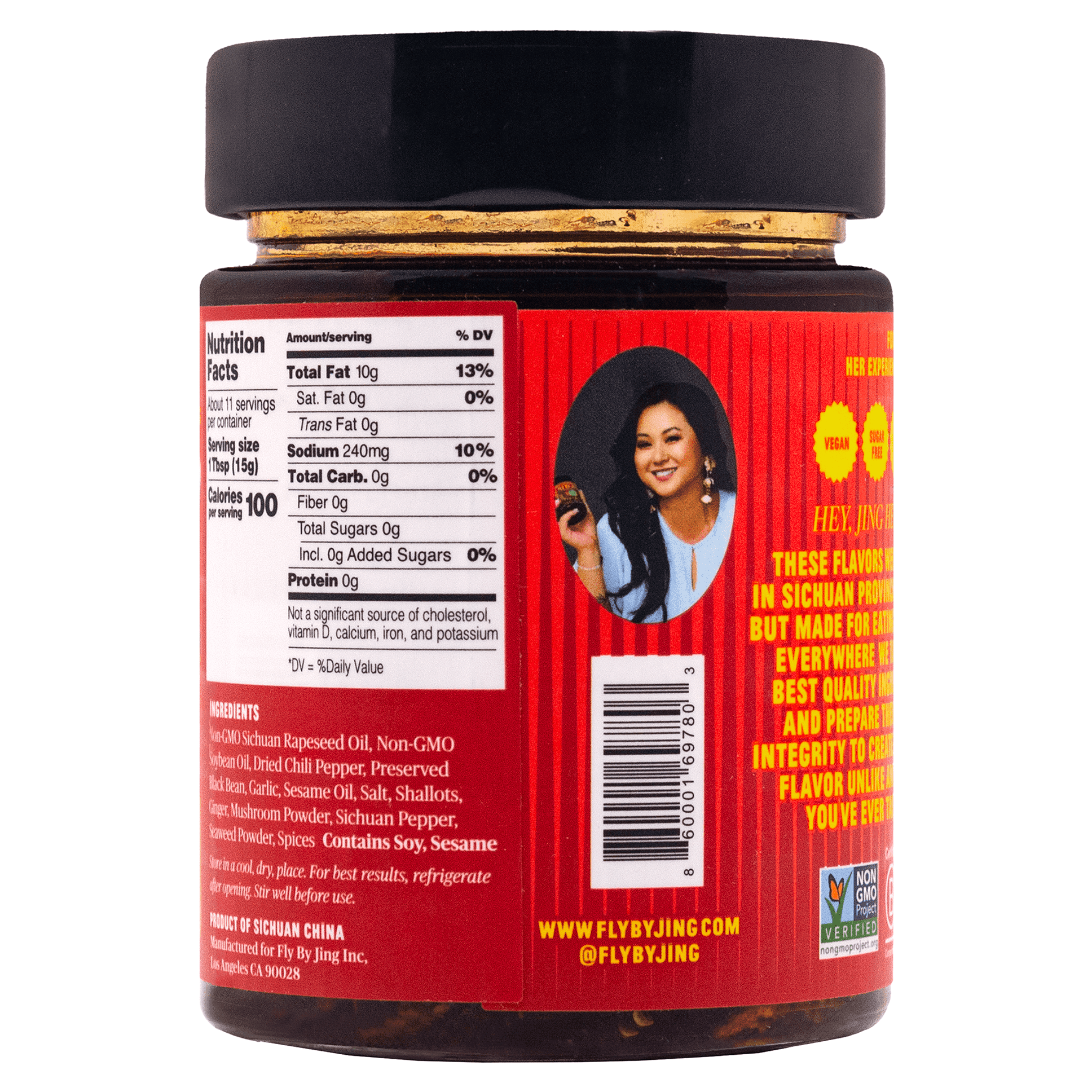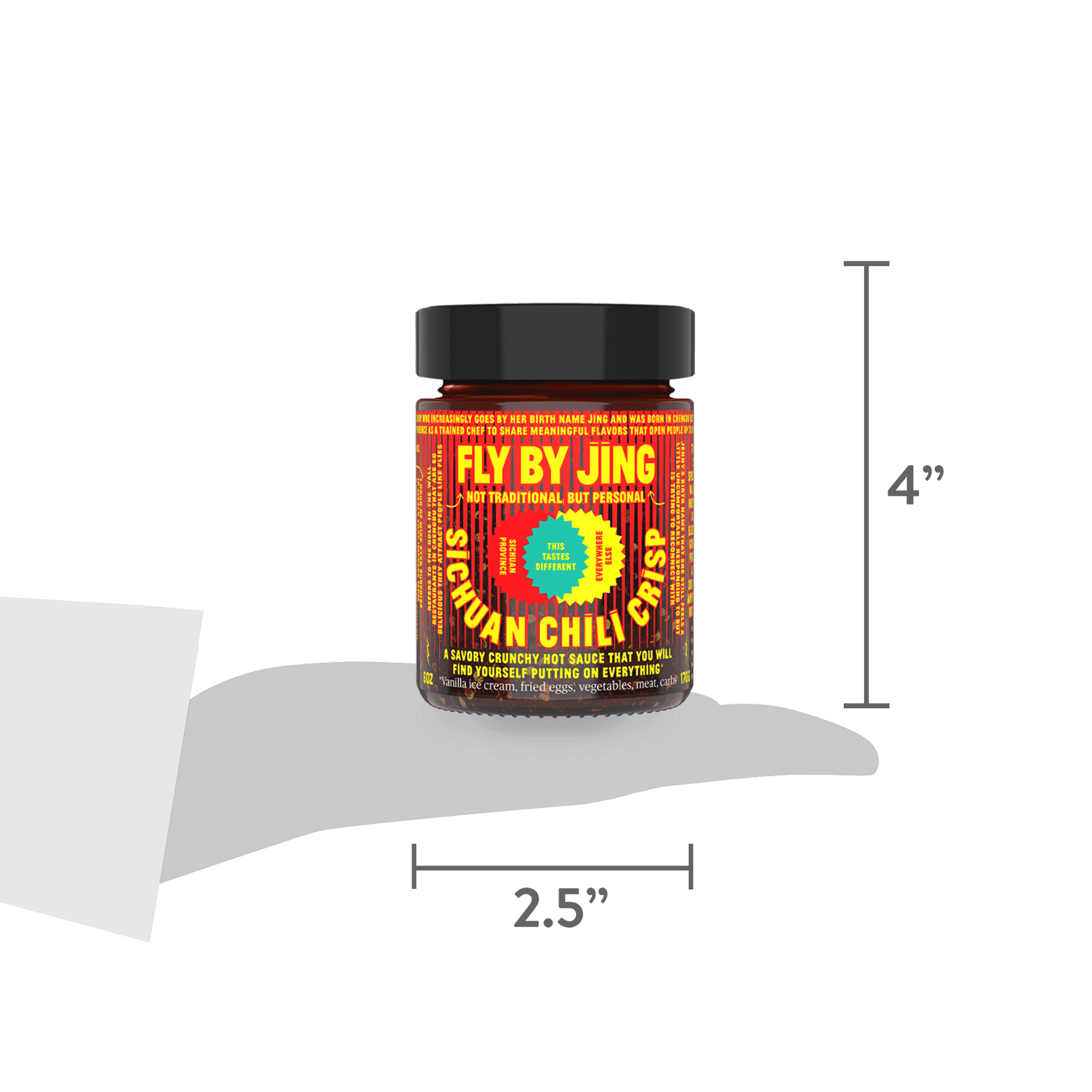 Fly By Jing Sichuan Chili Crisp is 6oz of hot, spicy, tingly, crispy, and deliciously savory chili sauce that tastes good on everything. Intensely flavorful yet not off-the-charts spicy, it’ll take your regular meals from meh to mmm. It’s good on everything, from tacos and burritos, to BBQ and pizza, noodles and dumplings. Fans even put it on ice cream! Upgrade your hot sauce to a crispy, all-natural, sugar-free, non-GMO project certified, keto, vegan chili crisp. There’s no MSG, or artificial preservatives or flavors in this small-batch chili crisp. Simply stir well, and then spoon out of the jar to make every meal better.