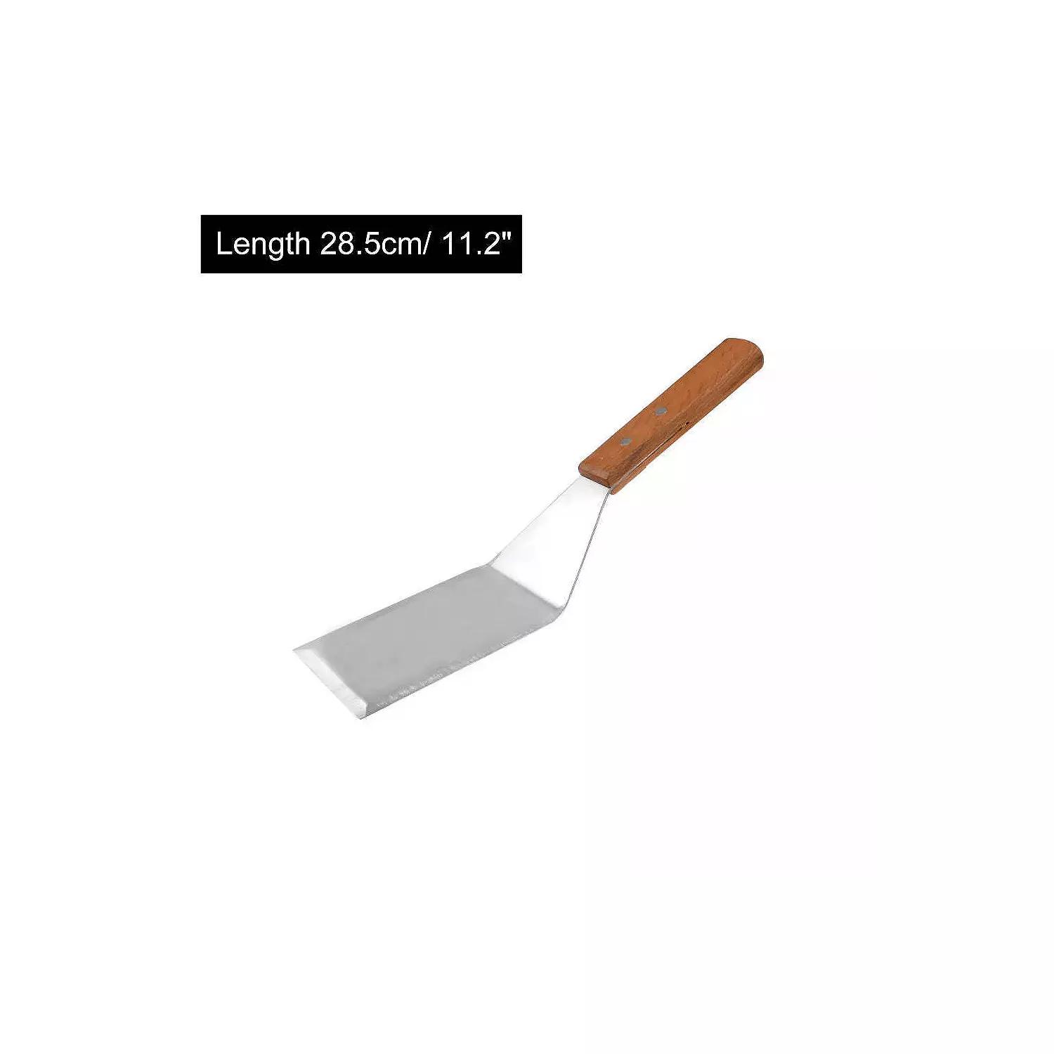 Material: Stainless Steel; Color: Silver Tone, BrownTotal Length: 28.5cm/ 11.2Spade Size: 11 x 7.1cm/ 4.3 x 2.8(L*Max.W)Handle Size: 12 x 2.3 x 1.3cm/ 4.7 x 0.9 x 0.5(L*W*T)Package Content: 1 x Wide SpatulaThis pancake-turner is a wide smooth spade design, which is very suitable for cooking. Made of stainless steel Spade and with a wood handle, this Turner is comfortable to grip. With a stainless steel cookie spatula that cuts on your effort. Get the greatest bang for your buck with a large turner spatula that combines affordable pricing with unmatched quality.