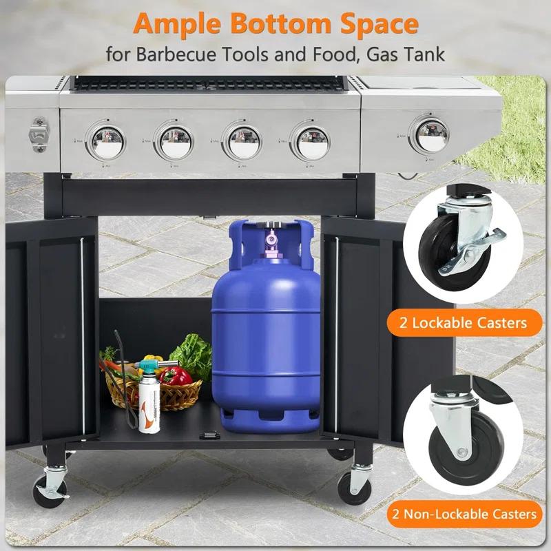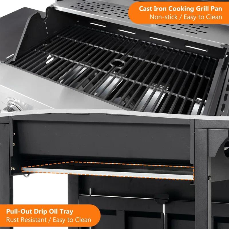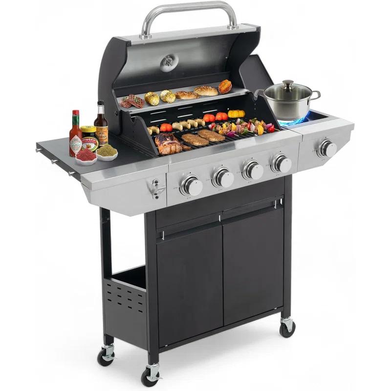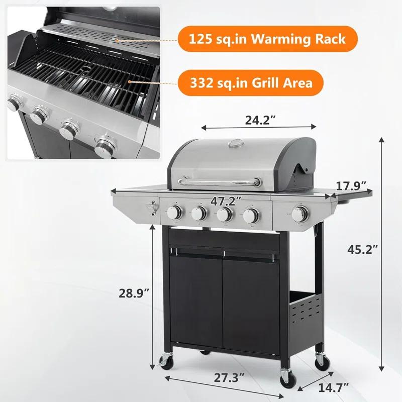 Elevate your grilling game with this sleek and powerful 4-burner propane gas grill. Featuring a high-performance stainless steel design, this grill is engineered for both professional and home use. With an expansive cooking area, an additional side burner, and a handy built-in bottle opener, it brings convenience and versatility to your outdoor cooking. Whether you're searing steaks, grilling veggies, or simmering a sauce on the side burner, this grill is your go-to for flawless meals every time. Designed for durability and style, it’s an essential addition to any outdoor space.