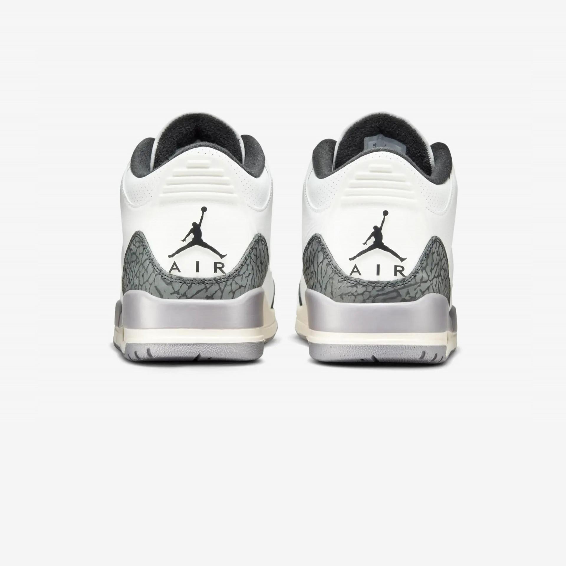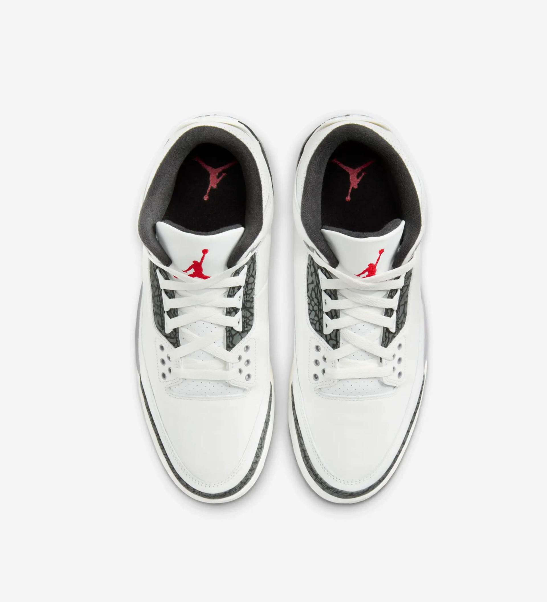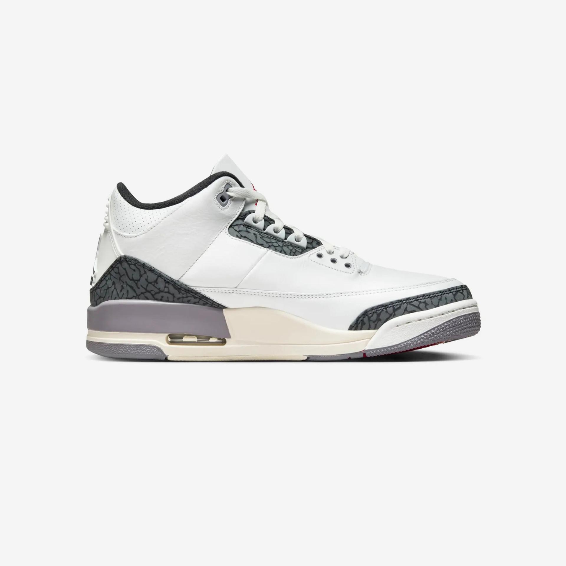 Add legendary status to your sneaker rotation with this brand-new "Cement Grey" colourway of the iconic Air Jordan 3 Retro. Built with a crisp tumbled leather base, this AJ3 merges White, Fire Red, Black, and Cement Grey hues alongside signature detailing, including the distinctive elephant print on the eyestay, toe, and heel overlays, and Jumpman logos on the tongue label, heel counter, and insole.