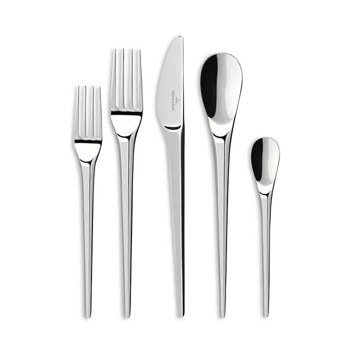 Set includes one of each: salad fork, dinner fork, dinner knife, soup spoon, teaspoon. Sleek and angular silhouettes bring modern design to your tablescape. Rust resistant. No polishing required