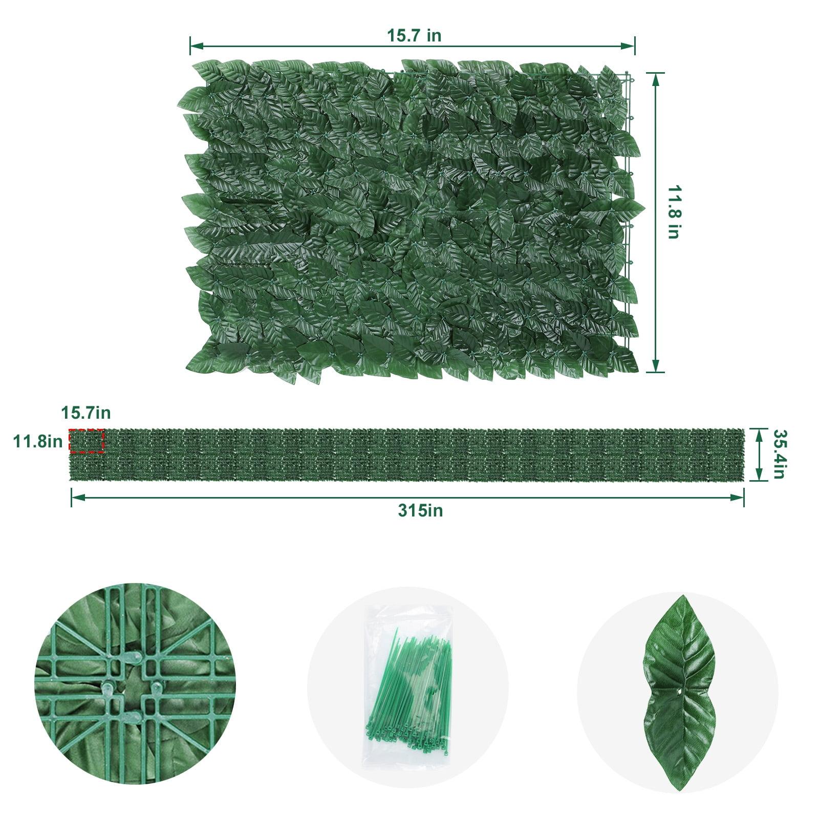 This faux green leaf privacy fence features an updated design with a larger area and more freedom. Each panel measures 16.5x12.6 inches with a total of 40 panels in a set.