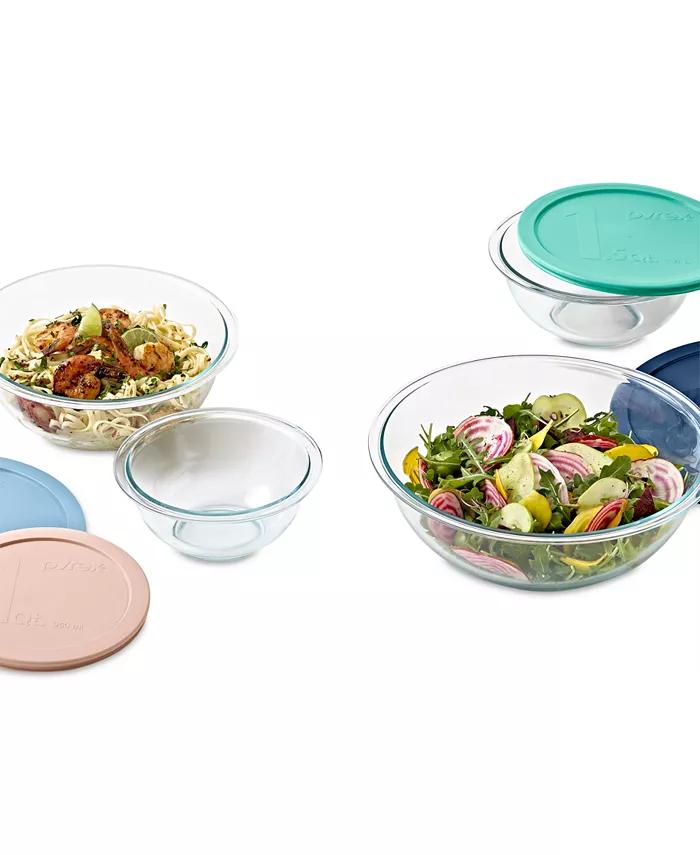 A wide range of sizes gives you perfect bowl for everything from serving a side dish to mixing batter with this set from Pyrex. The four bowls are in durable glass, with lids for storage.