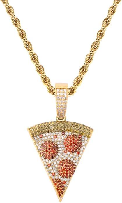 Jewelry Hip Hop Iced Out Exquisite Pizza Pendant Chain Pave Colorful Diamond 18K Gold Plated Solid Back Necklace with 24 Inch Stainless Rope Chain for Men Women