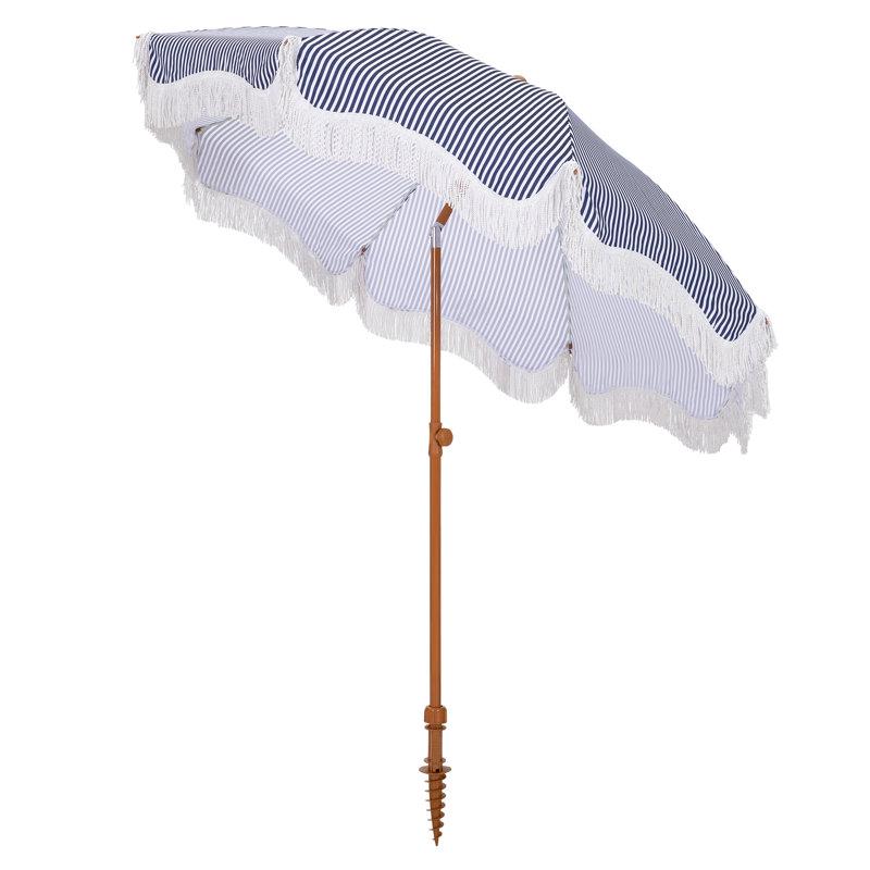 Create your outdoor oasis with this market umbrella. The octagon-shaped canopy is made from polyester in your choice of color, and it's adorned with fringe detailing for a touch of whimsy. This piece is built with a powder-coated metal pole with a manual lift design, and it has a push-button tilt to help block the sun as it crosses the sky from morning to afternoon. In addition, the canopy provides UPF 50 protection from the sun. Simply anchor this umbrella inside your compatible patio table or stand (sold separately), and enjoy.