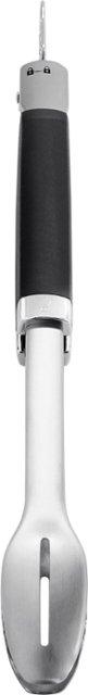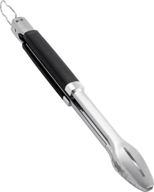 Handling food on the grill is easy with Precision Grill Tongs. The durable stainless-steel construction and soft-touch handle provide complete control with a comfort hold. The flat front edge design allows you to easily get under food as you lift and turn fragile foods like vegetables and fish, while the precision grip makes moving a heavy rack of ribs effortless. The hands-free locking mechanism closes the tongs for quick and easy use and compact storage.