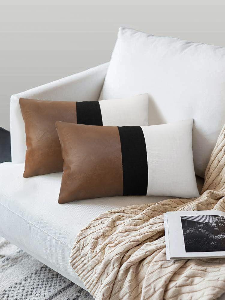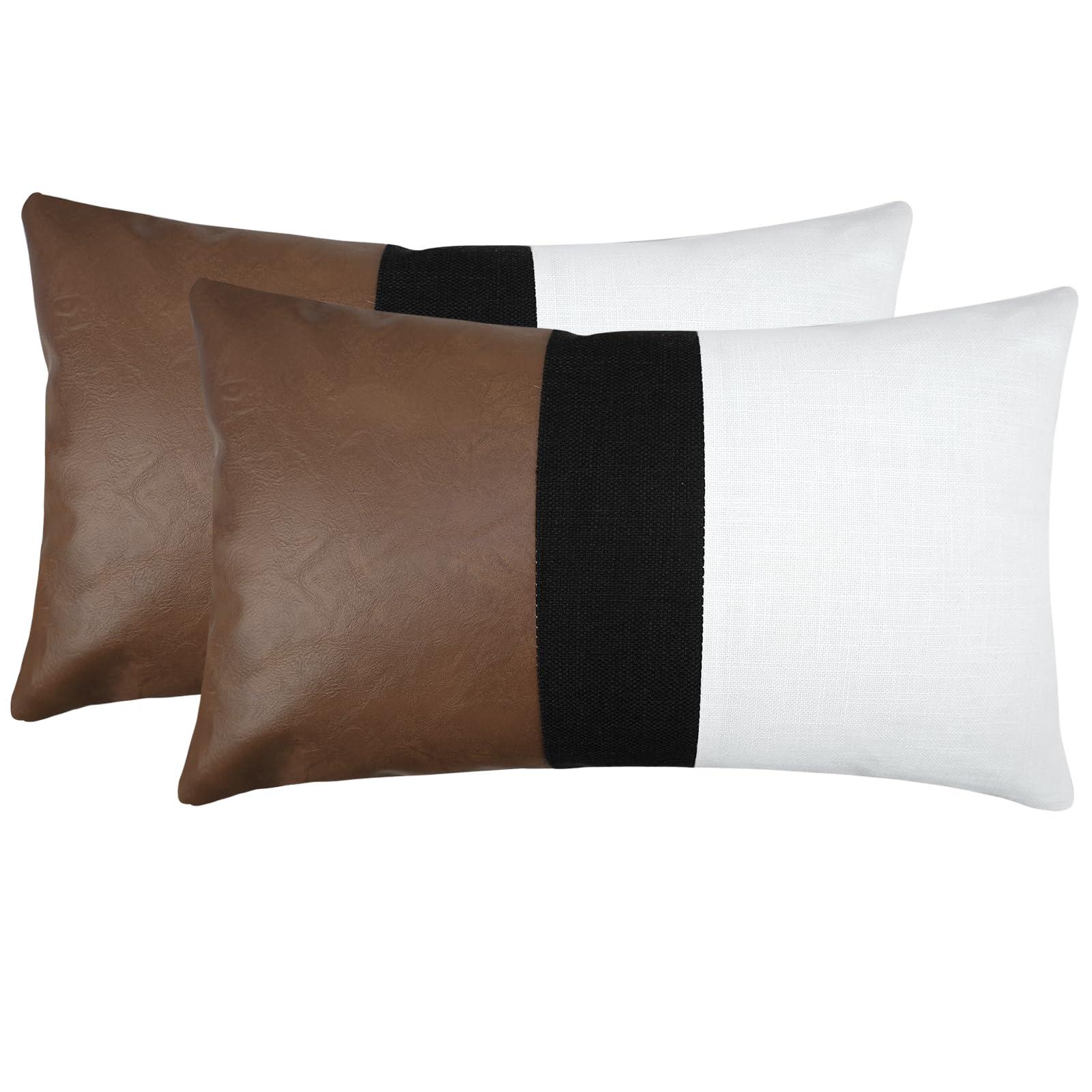 This throw pillow cover for couch features a color clash design of brown leather and classic black and white linen to create a look that suits both modern and country style homes.