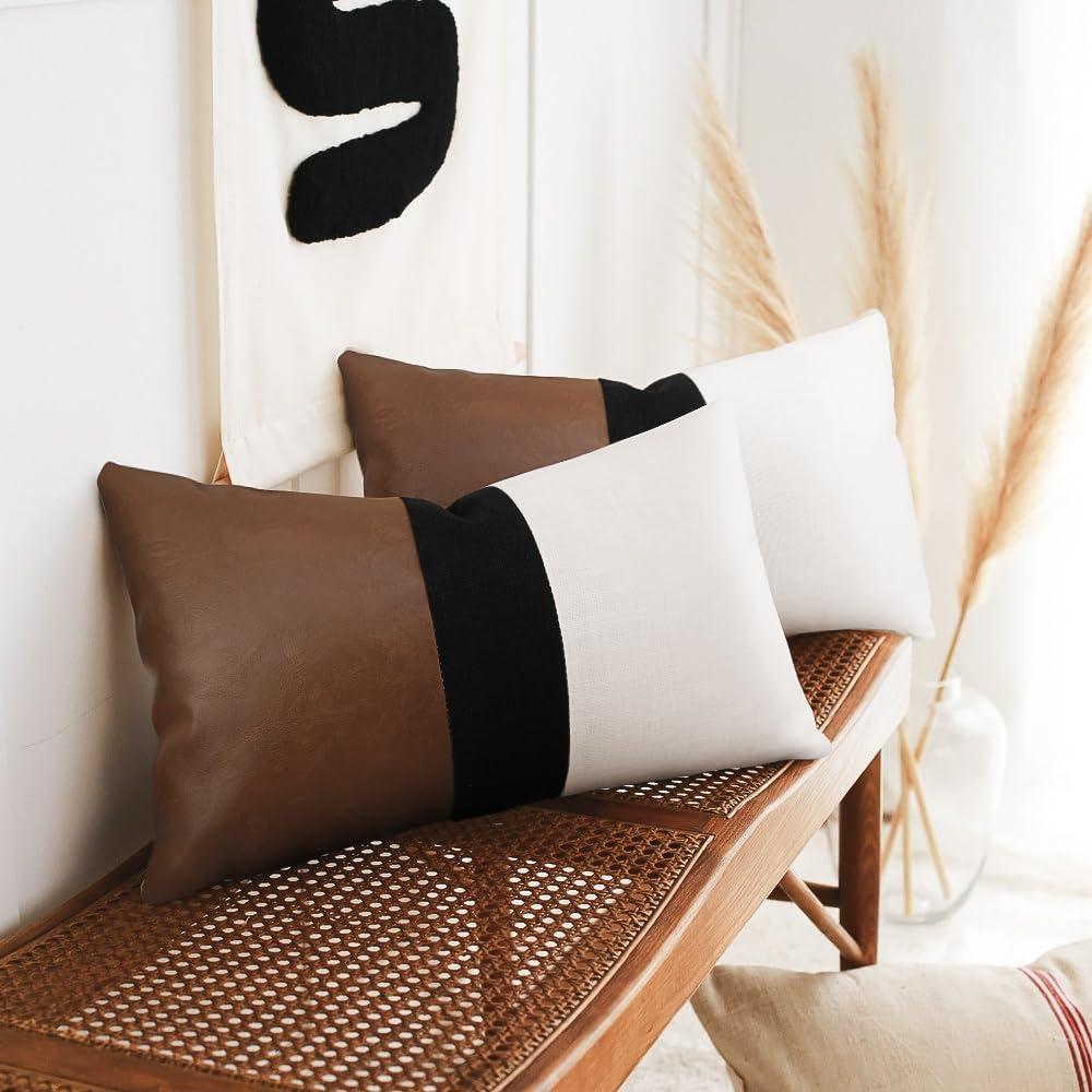 JASEN Set of 2 Faux Leather and Linen Lumbar Pillow Covers 12x20 Inch