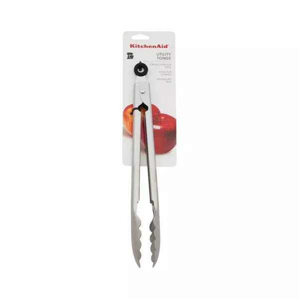 These KitchenAid Gourmet Stainless Steel Utility Tongs let you easily serve pasta, meats, and vegetables from platters and other serve ware. Crafted of sturdy, durable stainless steel. The pull-tab top allows you to just turn to lock tongs closed for convenient storage. Easy to clean, dishwasher safe. Tongs measure 12 inches long.