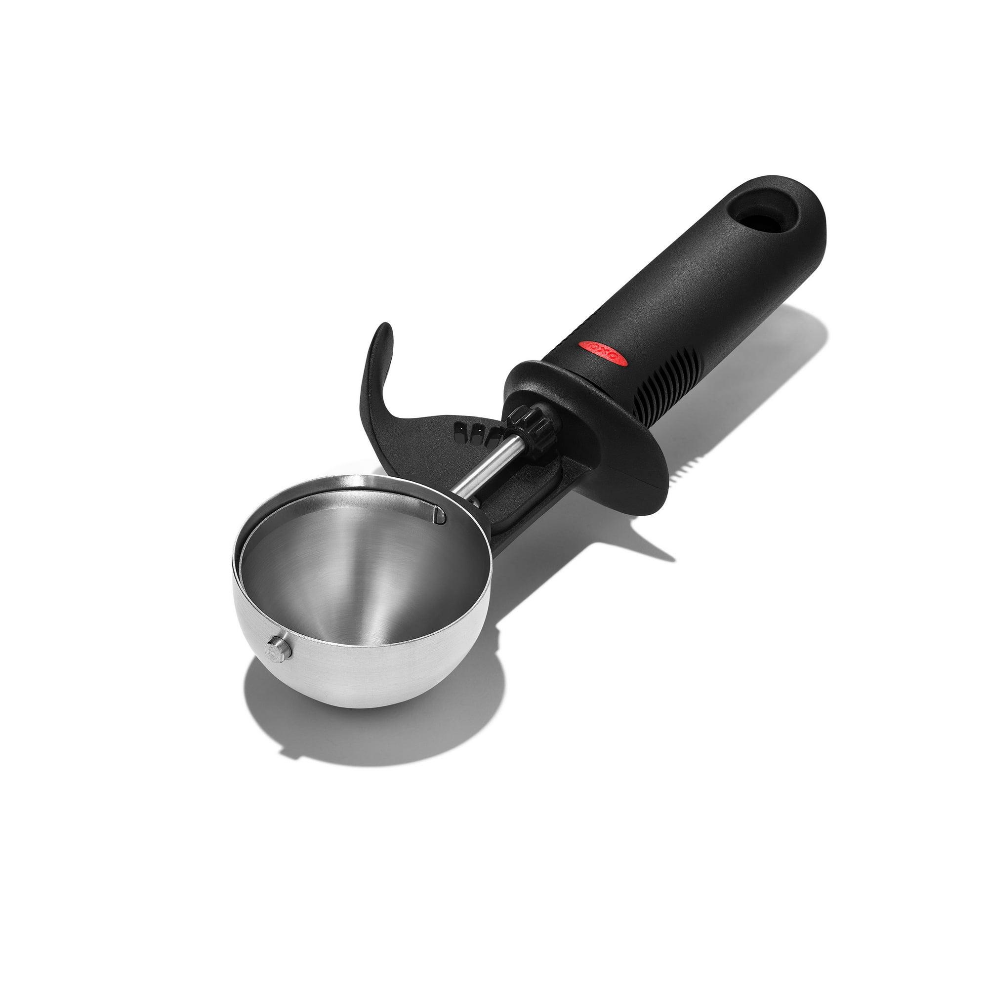 Scoop and release ice cream, sorbet and sherbet with ease with the OXO SoftWorks Classic Ice Cream Scoop. Our Scoop updates this timeless tool with durable stainless steel that won’t chip, pit or rust and a pop-up lever that releases scoops with a simple press. The handle features a soft, non-slip grip that absorbs pressure to minimize effort even when scooping hard ice cream. Dishwasher safe