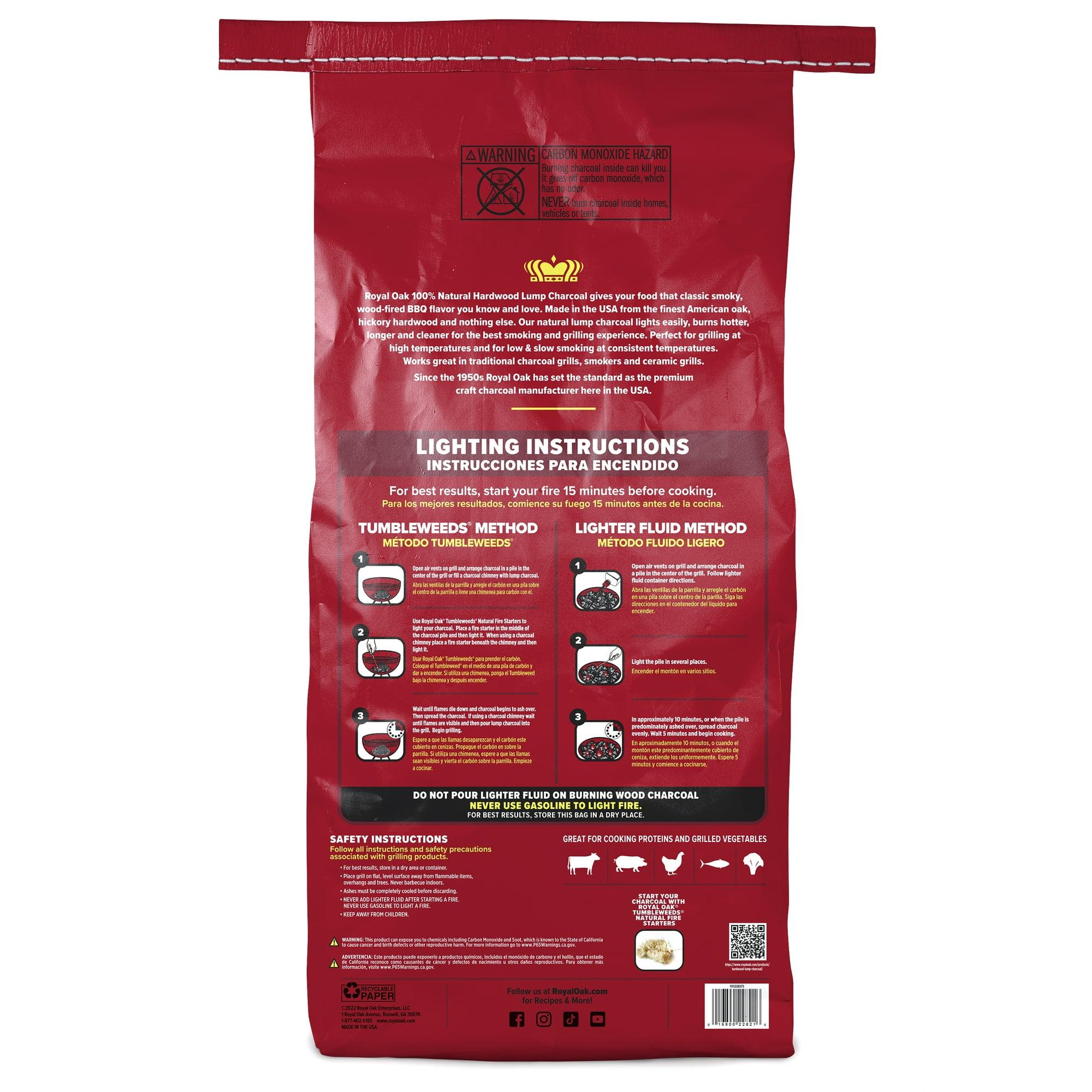 Royal Oak 100% Natural Hardwood Lump Charcoal gives your food that classic smoky, wood-fired BBQ flavor you know and love. Made from the finest American Oak, Hickory Hardwood and nothing else. Our natural lump charcoal lights easily, burns hotter, longer and cleaner for the best smoking and grilling experience. Perfect for grilling at high temperatures and for low & slow smoking at consistent temperatures. Works great in traditional charcoal grills, smokers and ceramic grills.