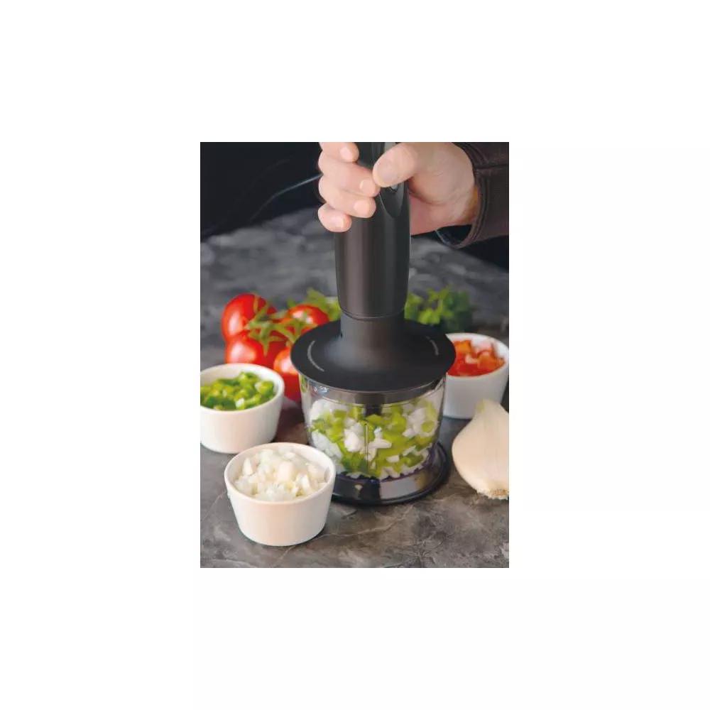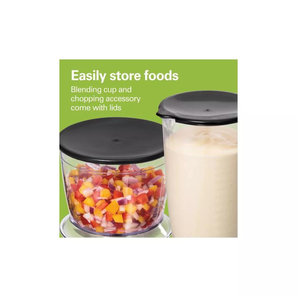 The Hamilton Beach® 7 Piece Hand Blender Set replaces the need for multiple kitchen tools and takes up less space. You'll reach for it every time you need to prepare a quick salad dressing, chop onions, make soup, puree dips and sauces, scramble eggs or make a batch of whipped cream to top off dessert. This versatile, multifunctional tool has 225 watts of peak power to effortlessly handle a variety of ingredients. It's perfect for pureeing cooked fruits and vegetables, blending ingredients in soups and making homemade baby food. With an easy-grip design and 2 speeds to choose from, you'll have more control and flexibility when blending, pureeing, mixing, whipping and chopping. Even better, there's no need to dirty extra dishes — just blend right in your pot, pan, bowl or jar. This versatile 7 piece set includes a blending wand, whisk, chopping accessory with lid, mixing cup with lid and motor body with power cord. For easy cleanup, all removable parts are dishwasher safe.