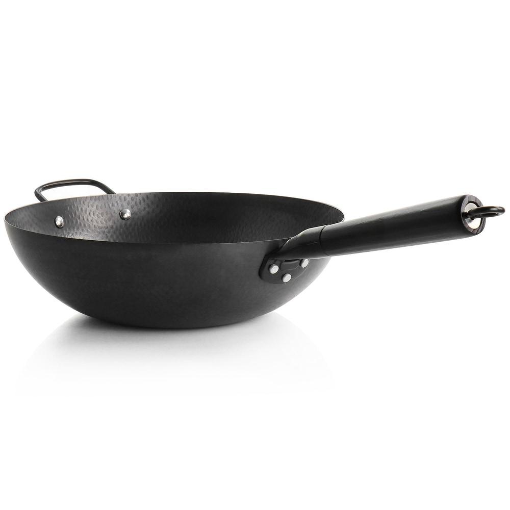 The Gibson Home hammered 13in carbon steel wok is just what you need when preparing a large meal for your family or for guests. Constructed with heavy gauge carbon steel material that heats evenly, this wok will cook large portions of food quickly and thoroughly.