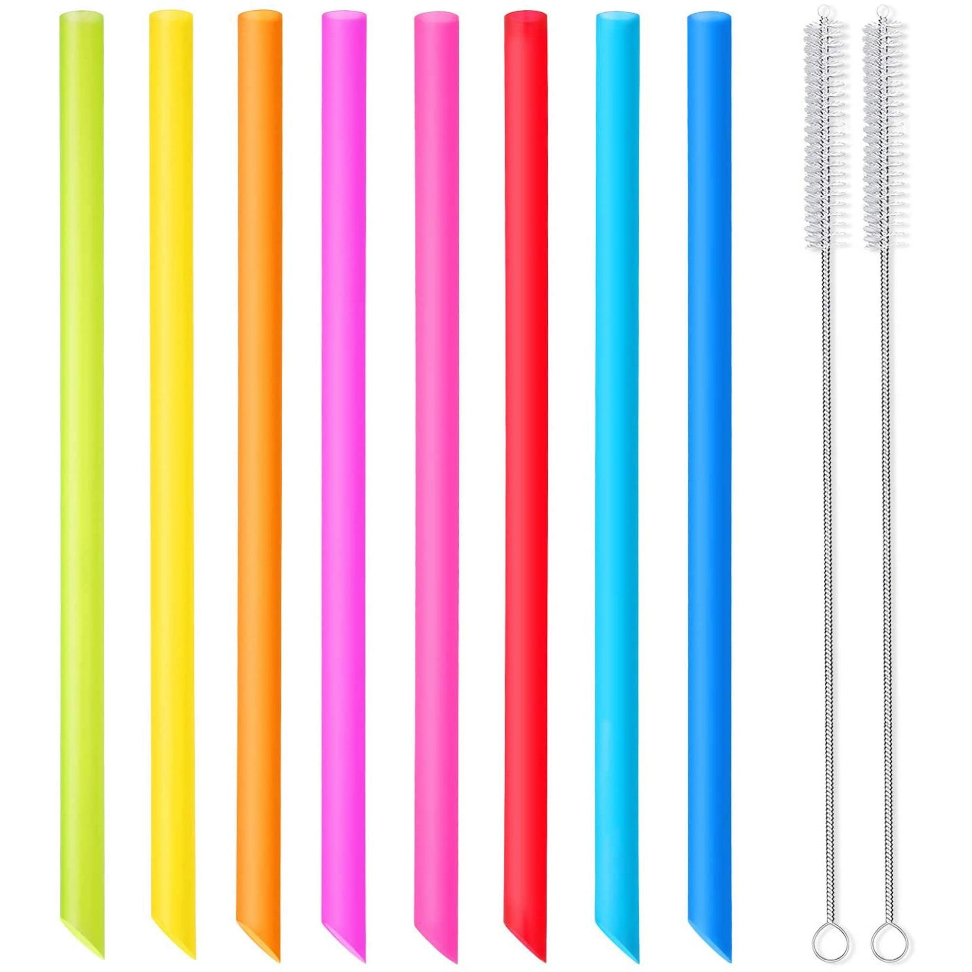 FOOD-GRADE & BPA FREE MATERIAL - Distinguish from disposable straws, we use reusable straws many times every day. In order to guarantee safe drinking, do our best to use healthy and non-toxic food grade materials, please feel free to use them in hot or cold beverage. BEST SIZE FOR BOBA & SMOOTHIES - 8 pcs multi-colors straws + 2 cleaning brushes. 10.5" long and 0.4 Inner Diameter / 0.47 Outside Diameter. Extra wide straws are the best ideal size for fat boba/ble tea (tapioca pearls, boba pearls), frozen smoothies, thick milkshakes, jelly, jumbo drinks and more homemade thick drinks