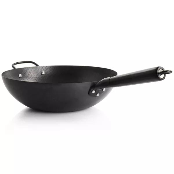 The Gibson Home hammered 13in carbon steel wok is just what you need when preparing a large meal for your family or for guests. Constructed with heavy gauge carbon steel material that heats evenly, this wok will cook large portions of food quickly and thoroughly.