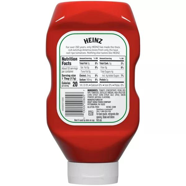 Heinz Tomato Ketchup is made only from sweet, juicy, red ripe tomatoes for the signature thick and rich taste of Americas Favorite Ketchup. Did you know that every tomato in every bottle of Heinz Ketchup is grown from Heinz seeds? Grown not made... One reason why nothing else tastes like Heinz! The thick texture makes our ketchup perfect as a topping or for dipping. Our ketchup pairs well with fries, hamburgers, hot dogs and all of your summer grilling favorites.