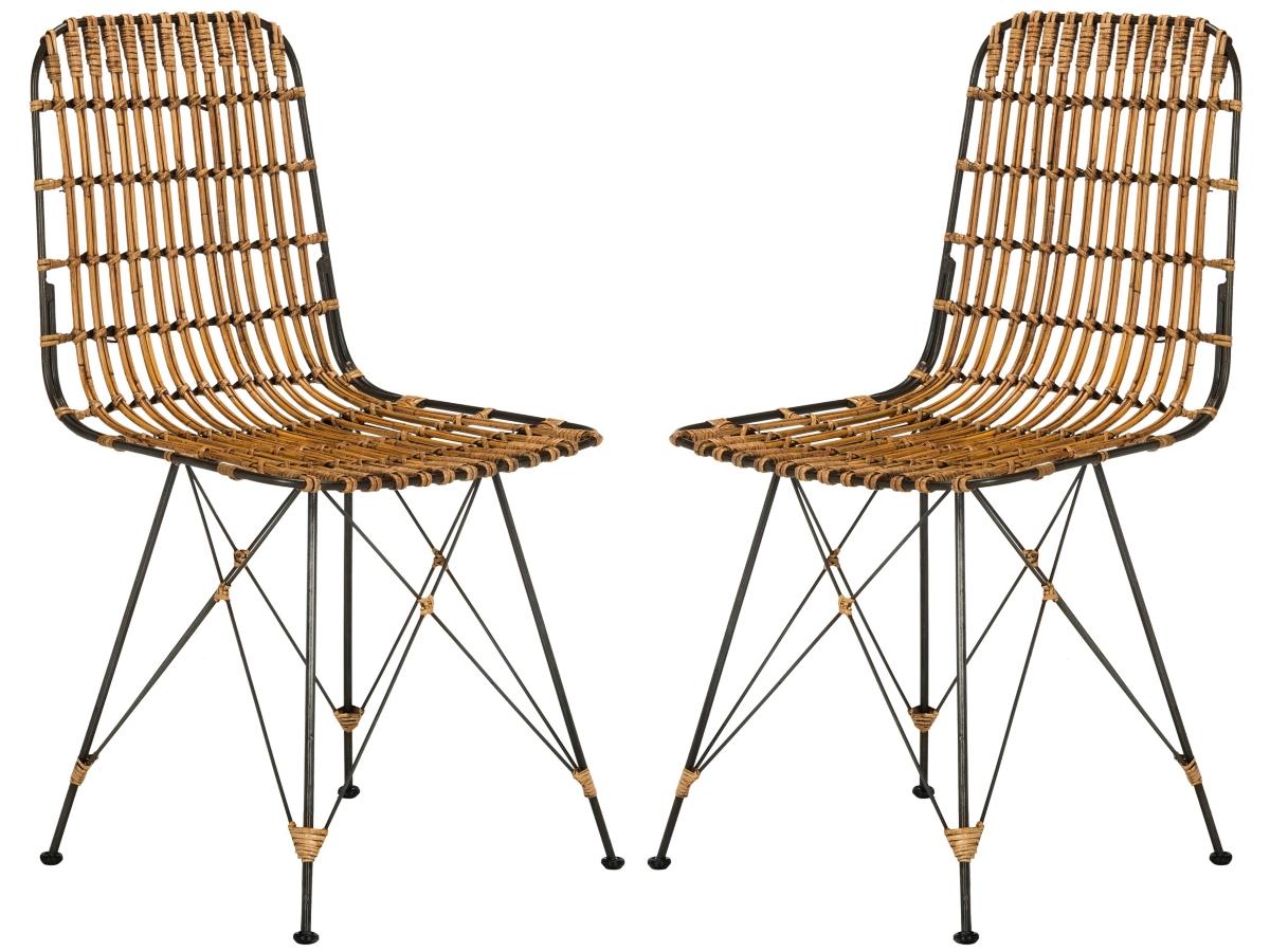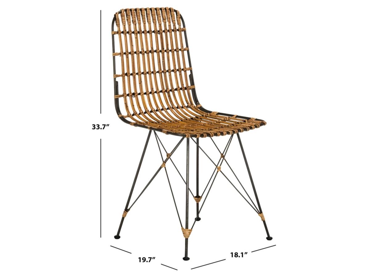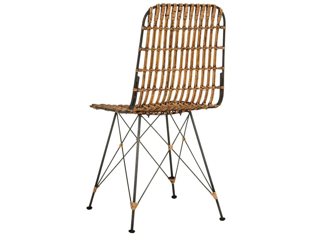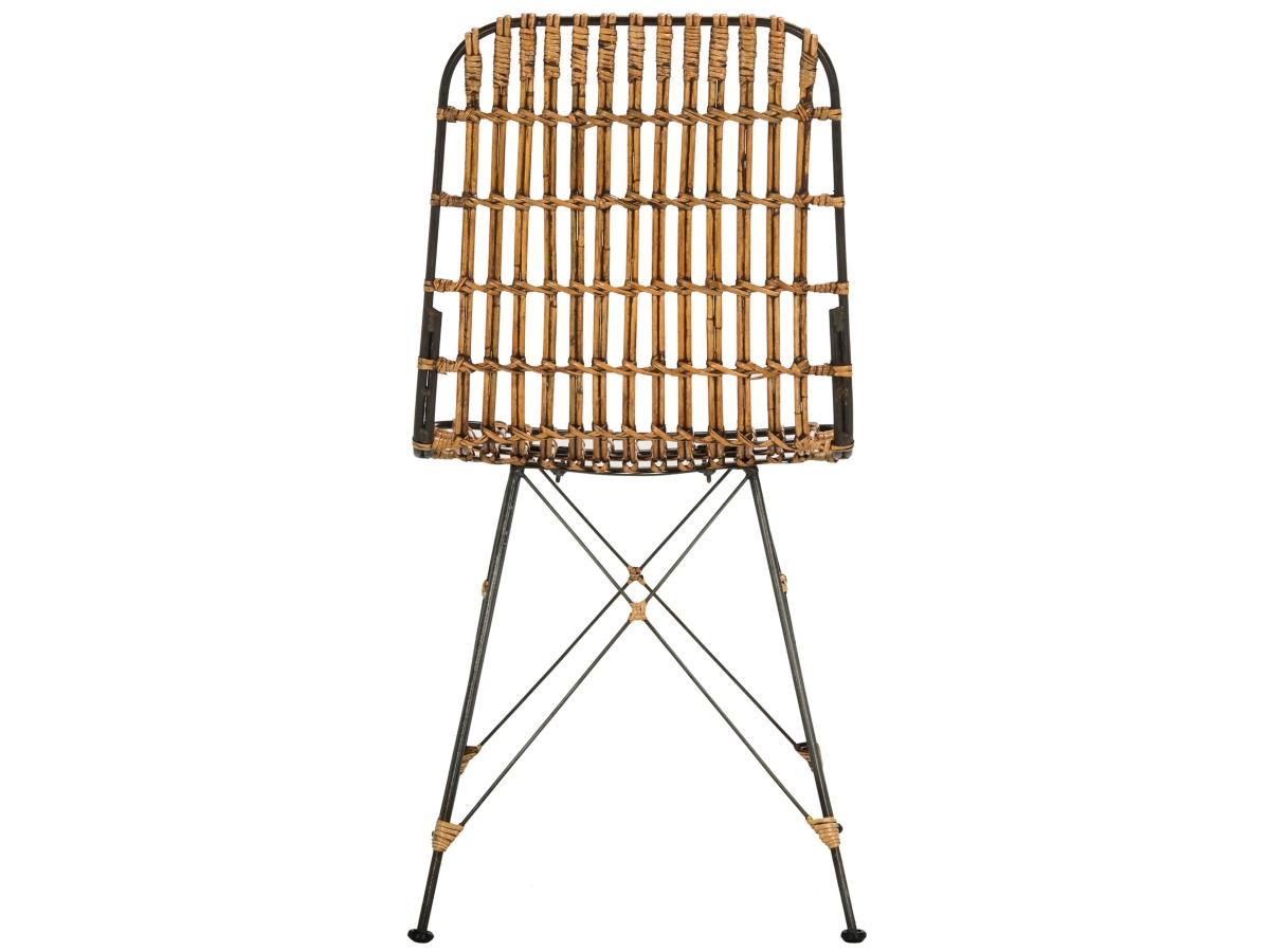 Crafted with fine, graphically sculpted lines, this modern natural brown wicker dining chair was designed to uphold the rigorous aesthetic standards of the contemporary host. Its sculptural metal legs and chic vintage style lend character to any soiree.