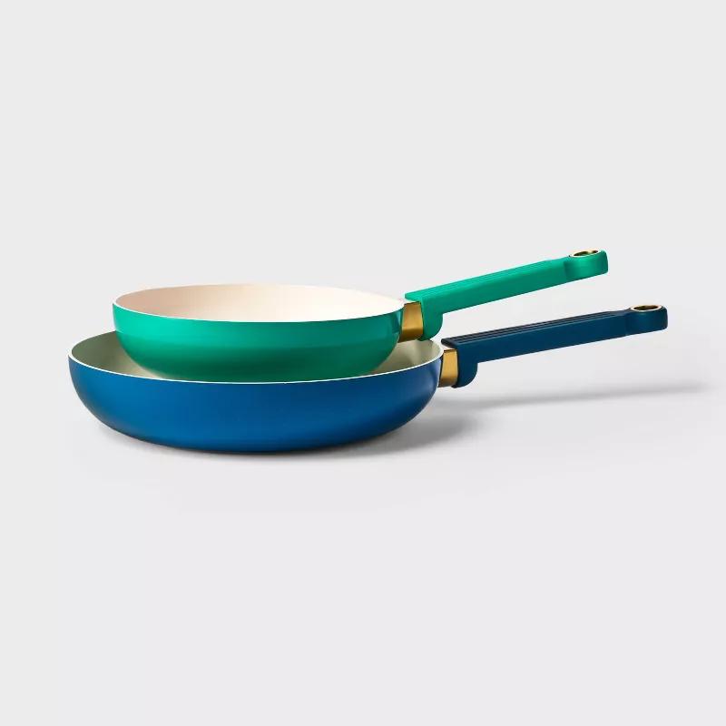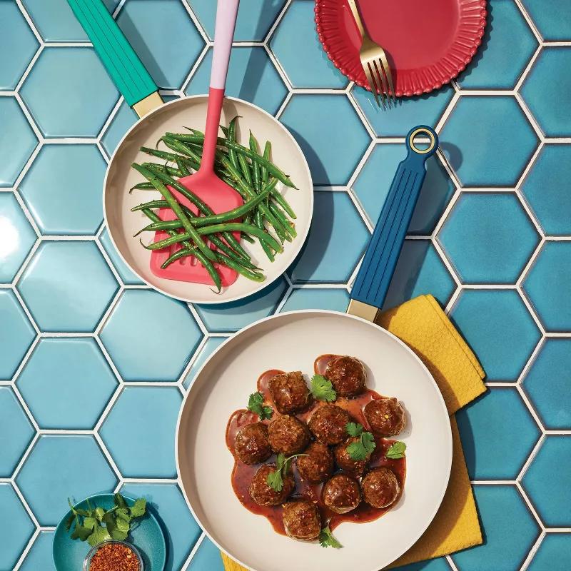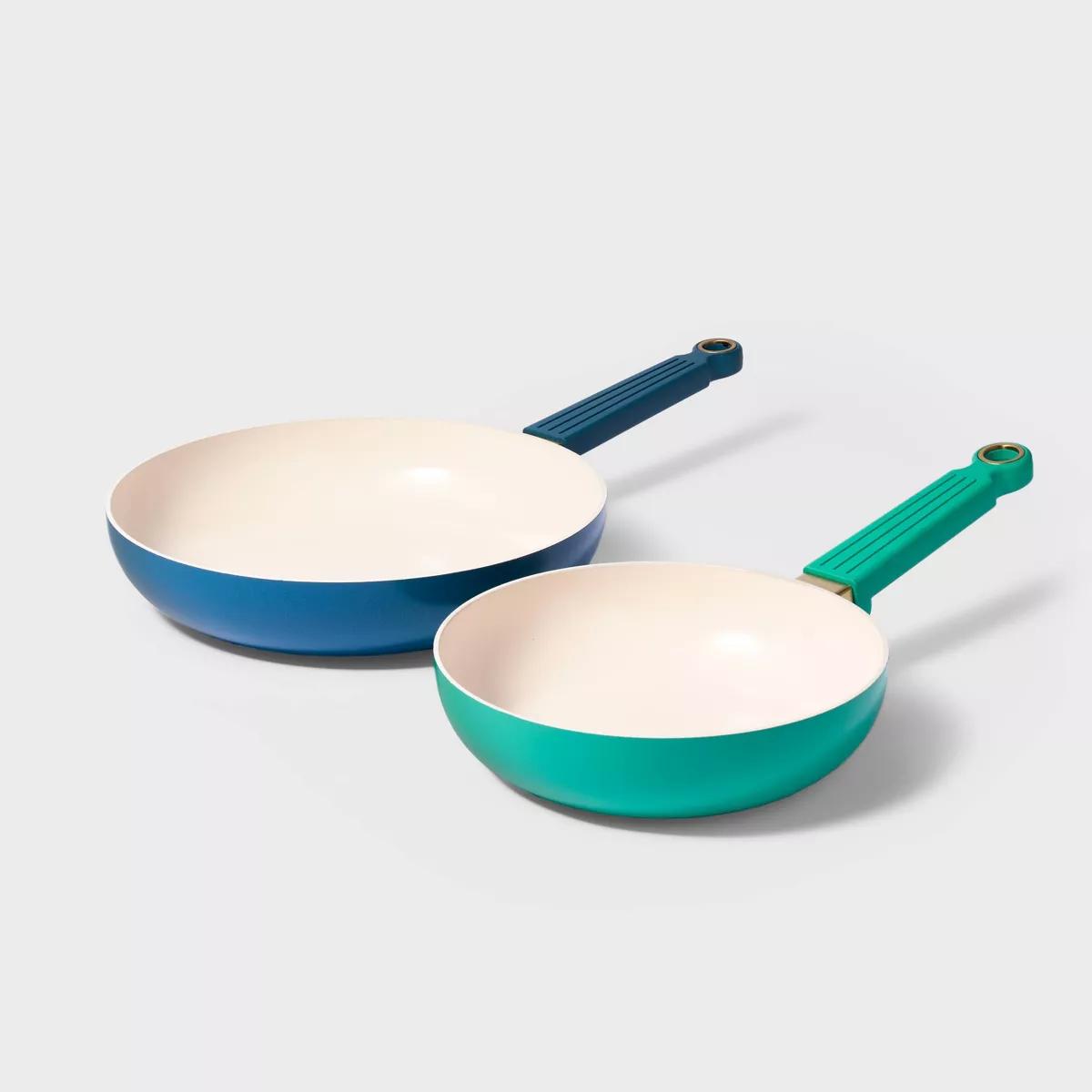 Add a pop of color to your kitchenware with this 2-Piece Ceramic Nonstick Fry Pan Set from Tabitha Brown for Target. This set includes an 8-inch fry pan in teal and a 10-inch fry pan in blue, both with ceramic cooking surfaces and aluminum exteriors for even heat distribution. Plus, the pans have heat-resistant handles and are compatible with induction, gas and electric stovetops.
