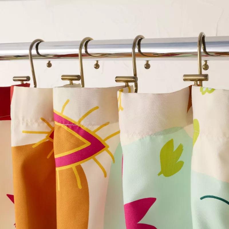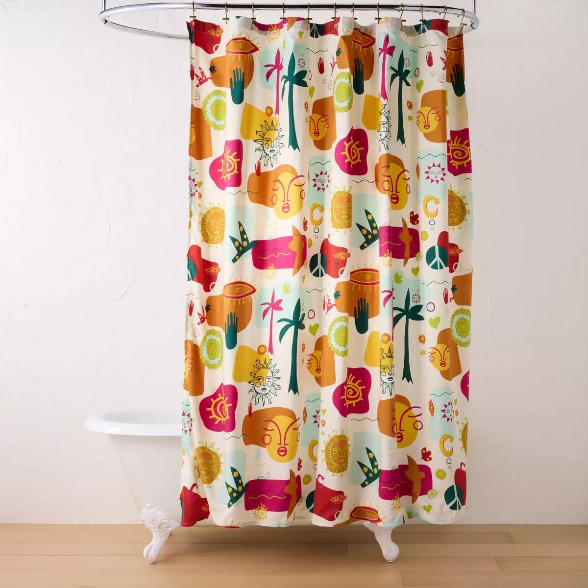 Fill your bath space with the boho chic appeal of this 2-Piece Collage Shower Curtain Bundle with Hooks from Opalhouse™ designed with Jungalow™. This set includes a decorative shower curtain featuring allover multicolor icons, graphics and face prints on a white background, and it comes with 12 S-shaped curtain hooks in black. Crafted from 100% recycled polyester, the printed shower curtain features a buttonhole top for easy installation, while the machine-washable design allows for easy cleanup whenever needed. Meet Justina Blakeney of Jungalow, now partnering with Opalhouse to inspire lived-in spaces that feel cozy, wild and free.