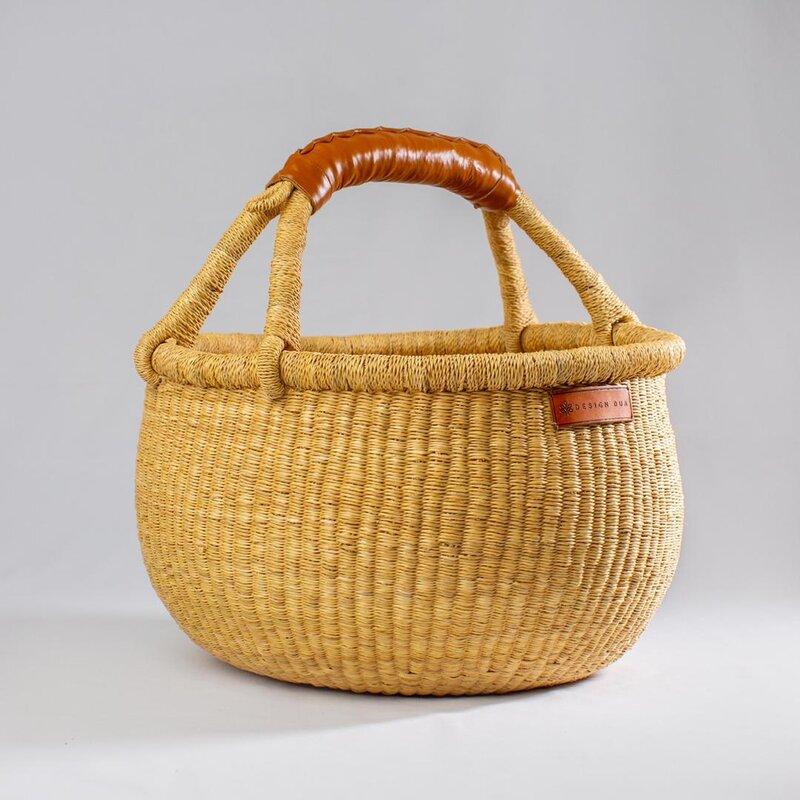 Our Bolga baskets are your perfect storage and shopping baskets. These baskets are made by the indigenous women of the upper east region, predominantly Bolgatanga. These trendy baskets also double up as good home decor pieces. Talking of affordability, these totes come with genuine leather handles, and the best part is that they're handmade or fair trade. I hope you love it. Your basket might have a crease or fold during transit. Please wet, reshape, and dry in an airy space. Made from 100% elephant grass. The dimensions of this basket are medium: 11–12" H x 9–10" W (Varies due to handmade nature).