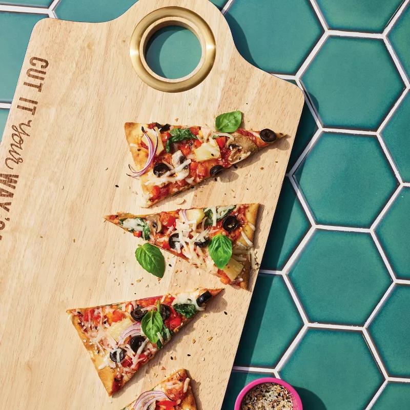 Give your kitchen a unique and versatile update with this "Cut It Your Way Cause It's Your Business" Cutting Board from Tabitha Brown for Target. This practical wood cutting board is perfect for serving and chopping fruit, cheese, cold-cut spreads, appetizers and more. Plus, it adds a cool vibe with the “Cut It Your Way ‘Cause It’s Your Business” inscription. The handle hole is great for space-saving hanging storage, and the board can be hand washed after use to keep it looking its best.