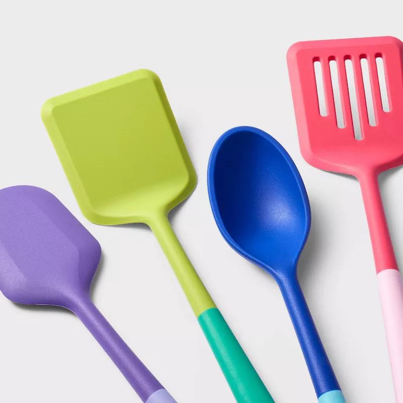 This 4-Piece Silicone Kitchen Utensil Set from Tabitha Brown for Target makes the perfect addition to your set of kitchenware. Designed in an assortment of colors, this utensil set includes three different spatulas and one spoon that are heat resistant up to 420 degrees. Plus, they're made from silicone and are dishwasher safe for convenient cleaning.