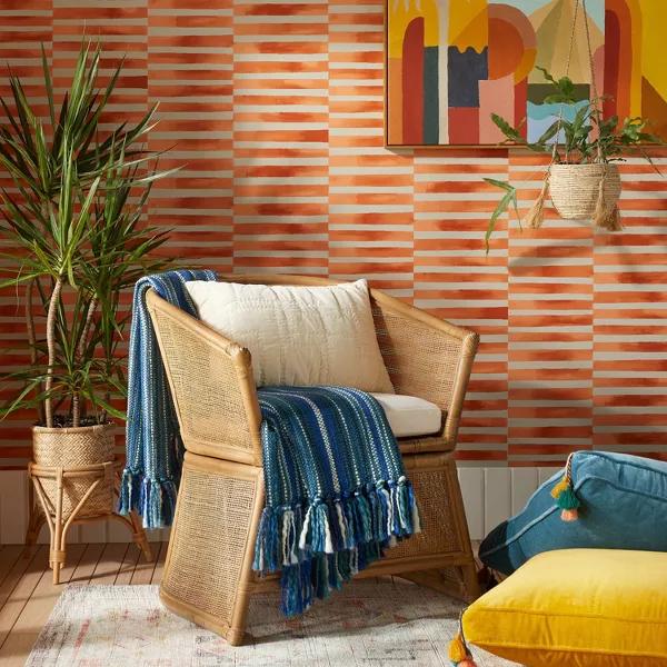 Off-White wallpaper adorned with painterly, irregular stripes in coral Includes 1 self-adhesive roll that can cover 27.5sq ft area Peel-and-stick design allows quick, simple application to any smooth, flat surface Can be easily removed without damaging walls or leaving residue Offers versatile use for walls, cabinets and drawers, bookshelves, windows and more