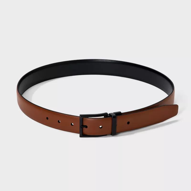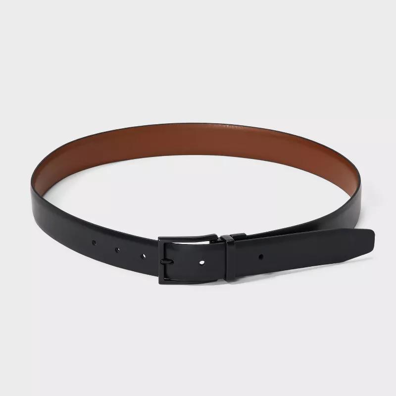 Give your ensembles a perfect finishing touch with this Two-in-One Reversible Dress Belt from Goodfellow & Co™. Made from flat faux-leather material, this dress belt features a smooth finish for a classic look, while the reversible design in brown and black allows for versatile wear. Best of all, it's designed with a metal buckle closure with multiple holes to let you customize the fit.