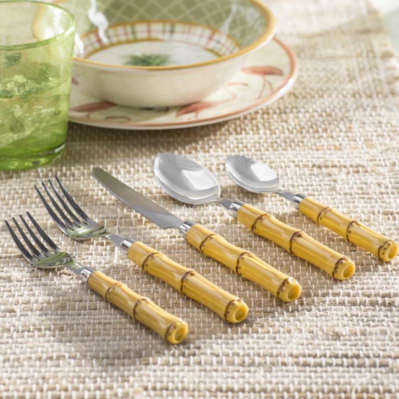 20-piece service for 4 features bamboo-shaped, dishwasher safe plastic handles. Perfect for giving a natural, tropical aesthetic. Pair with rattan chargers and chinoiserie plates for a timeless, colorful tablescape.