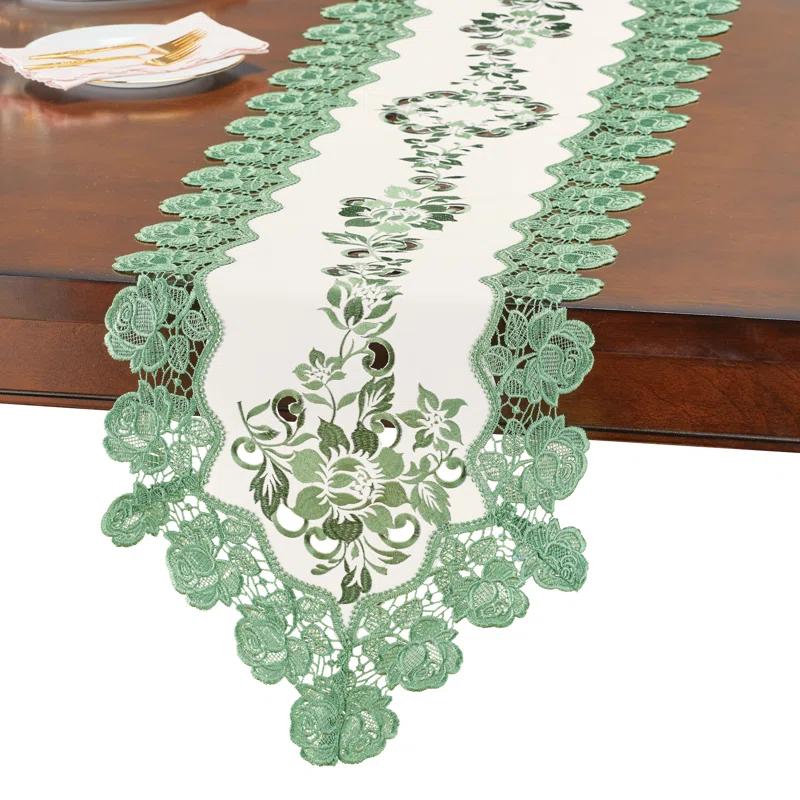 These elegant table linens feature embroidered roses in your choice of green or blue atop a white background with delicate lace along the edges. Beautiful on their own or with a coordinating tablecloth underneath (sold separately). Machine wash. Polyester; imported. Choose: Blue or Green. Available in: Runner (71"L x 15"W) or Square (34"Sq.).