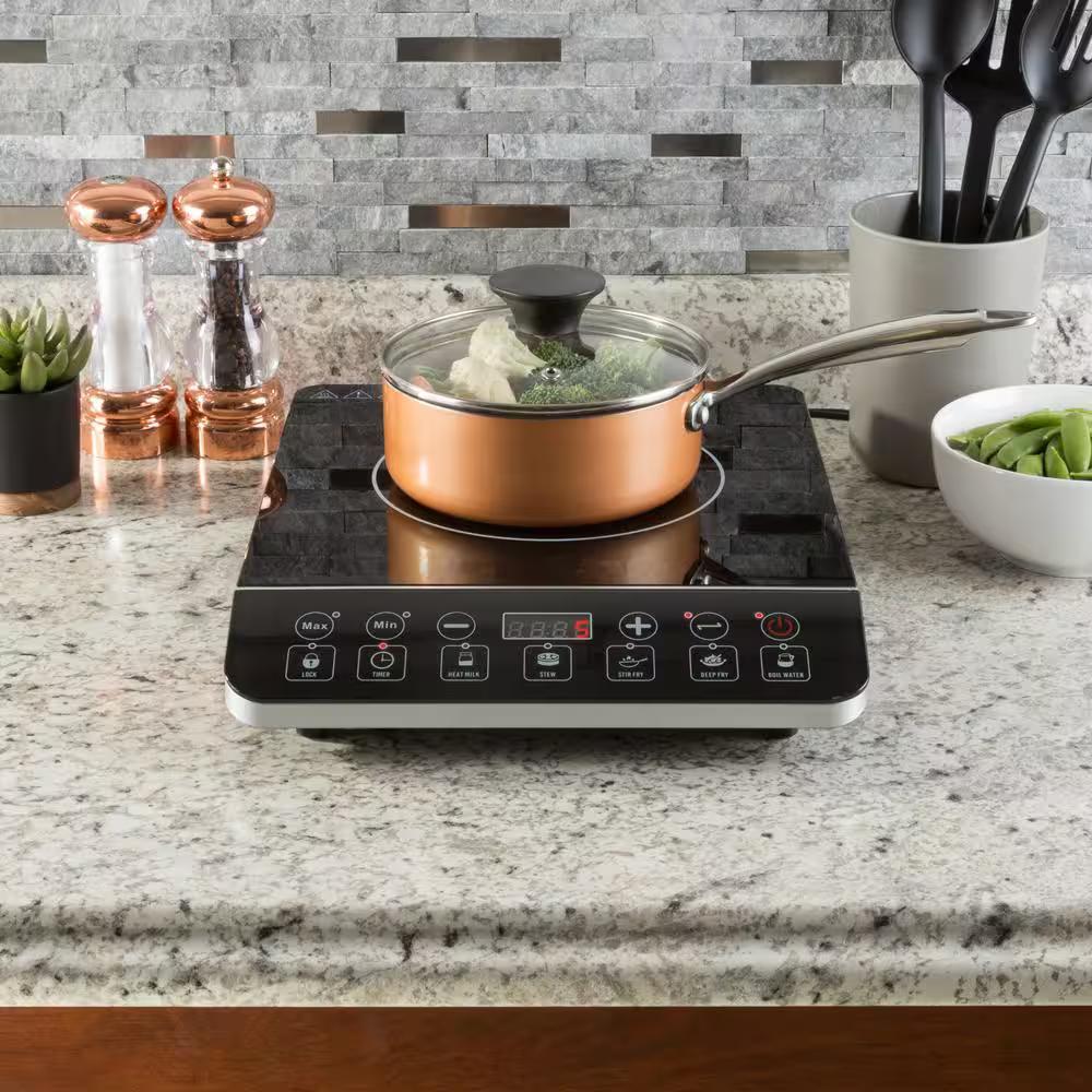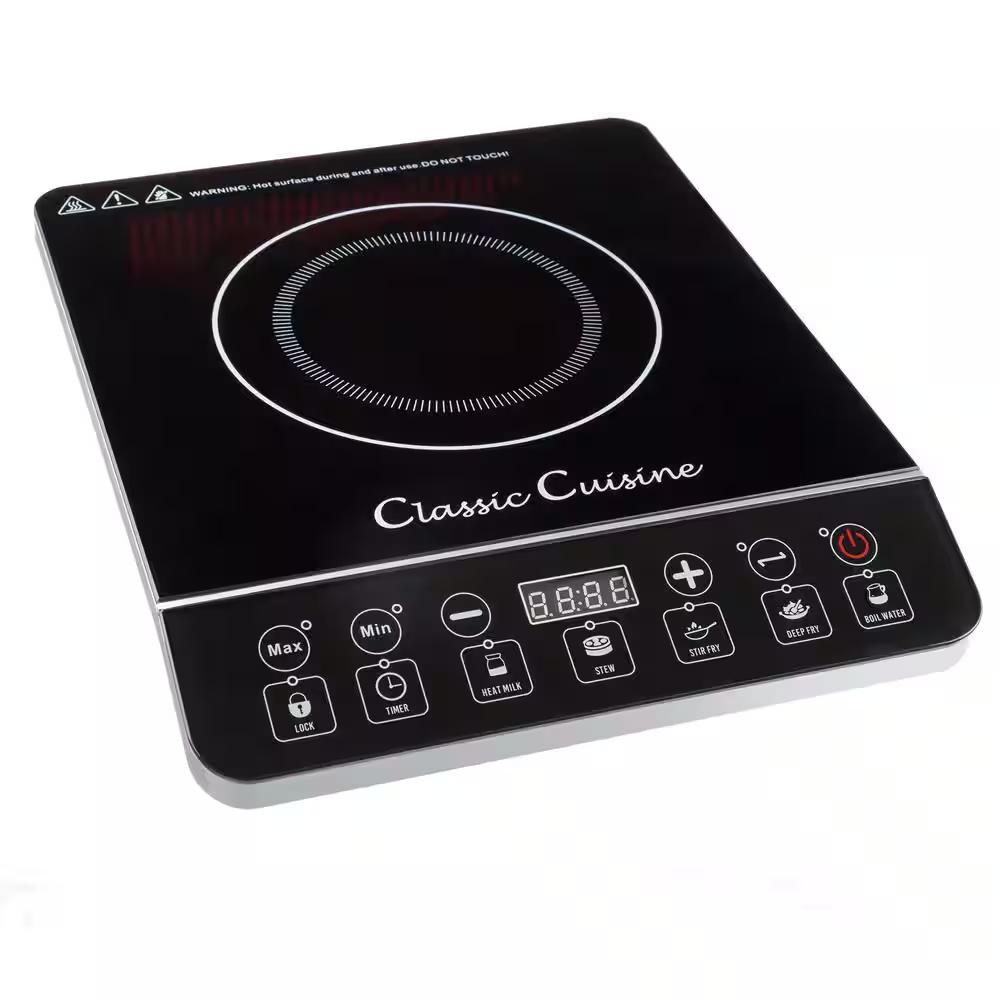 Equip your home, RV, camper, or dorm room for fuss-free cooking with this 1800-Watt Induction Cooktop Hot Plate by Classic Cuisine. Compact, lightweight, and simple to store, this electric stove top has 10 power settings ranging from 200 to 800-watts with 140 to 460-degrees Fahrenheit temperatures, allowing you to do everything from warm up canned goods to cooking complete meals on this single induction burner. A safety lock and automatic shutoff feature that prevents heating when pans are improperly placed on the induction cooktop or are removed ensures worry-free use of this energy-efficient electric cooktop that uses no flames, gas, or heating elements.