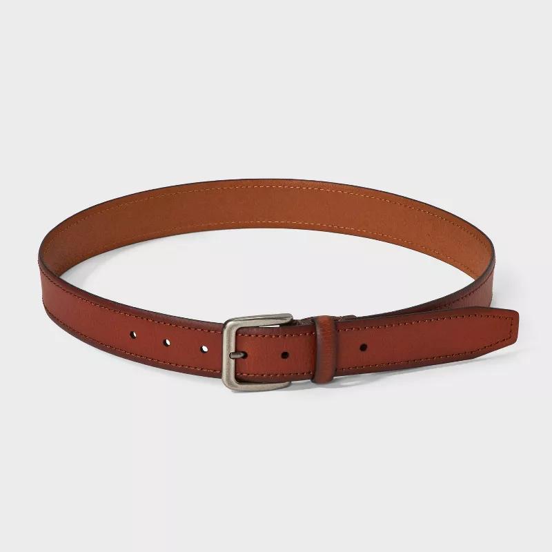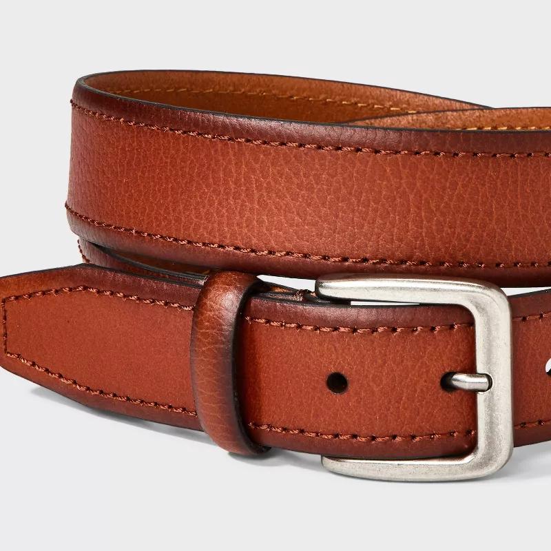 Complete your outfit in sleek style with this Leather Dress Belt from Goodfellow & Co™. This tan medium belt is made from 100% flat leather material for a comfortable and classic look. It also has a shiny silver buckle closure to complete the classy look and allows you to get a customized fit with multiple holes and loop. Pair with any of your pants to feel great all day. Goodfellow & Co™: Where style & fit are always in good company.