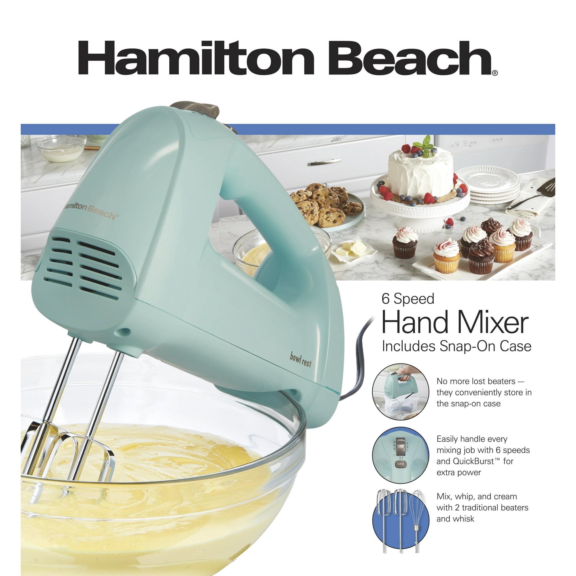 Hamilton Beach 6 Speed Hand Mixer with QuickBurst, Includes Snap-On Storage Case and 3 Attachments, Blue