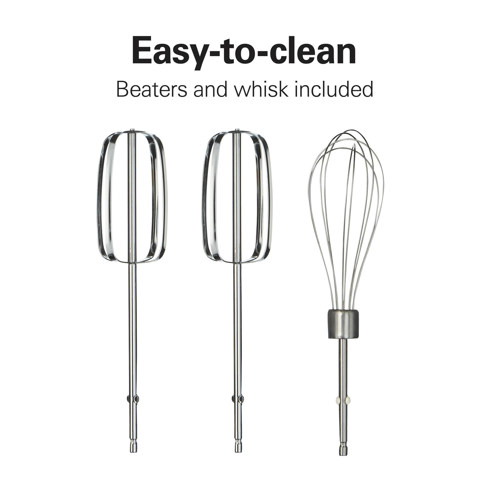 The Hamilton Beach® 6 Speed Hand Mixer with QuickBurst™ includes a storage case that easily snaps onto the mixer to instantly store attachments and prevent lost beaters. The electric hand mixer has 6 speeds to easily handle every mixing job, from making chunky chocolate chip cookies to frothy whipped cream. The QuickBurst™ button gives you an added burst of power when you need it at any speed level. Mix, whip and cream with the 2 traditional beaters and a whisk that are included.