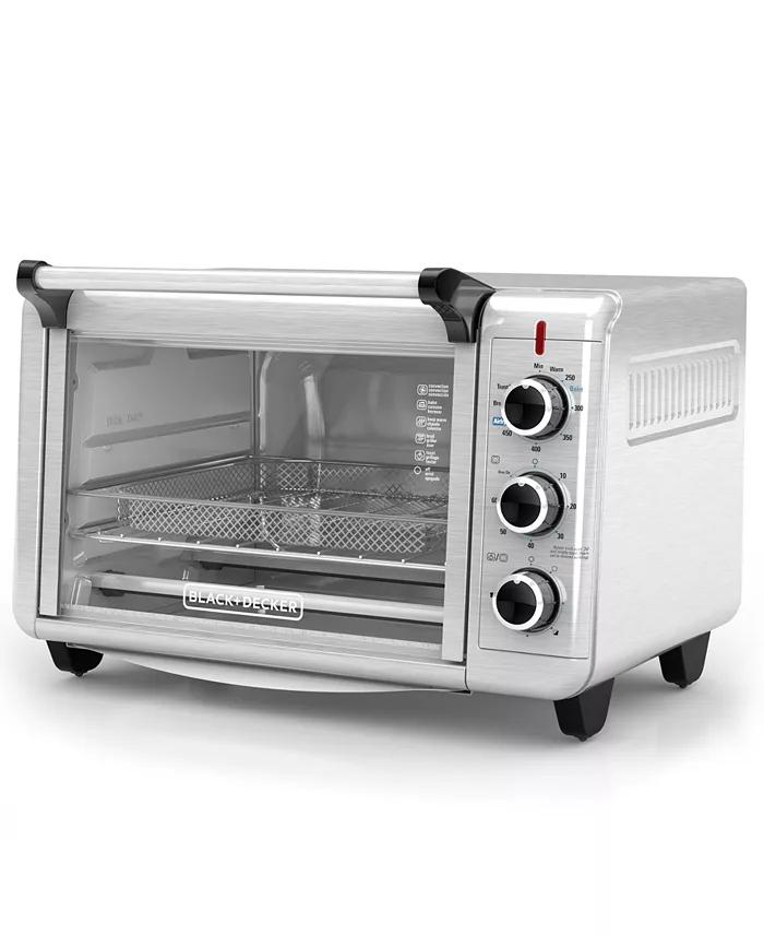 Introducing Air Fry Technology, new in the BLACK+DECKER Crisp 'N Bake Air Fry Toaster Oven. This is deep fried taste without the fat! Air Fry Technology uses high intensity hot air to bake, brown, and crisp your favorite fried foods with little to no oil. Try French fries, veggie chips, breaded fish filets, frozen snacks, and a lot more! This sleek and stylish toaster oven has space for up to six slices of bread or a 12" pizza. Three control knobs make it easy to set the toast timer and 60-minute timer, and choose from five cooking functions: bake, broil, toast, keep warm, and air fry. Convection technology circulates air within the oven for fast and even results when air frying. Plus, this toaster oven includes an air fry basket, bake/broil pan and rack, and an external crumb tray that slides in and out to make cleanup a breeze. Finally, keep an eye on food during cooking. The durable glass window gives you a clear view of food throughout the cooking process.
