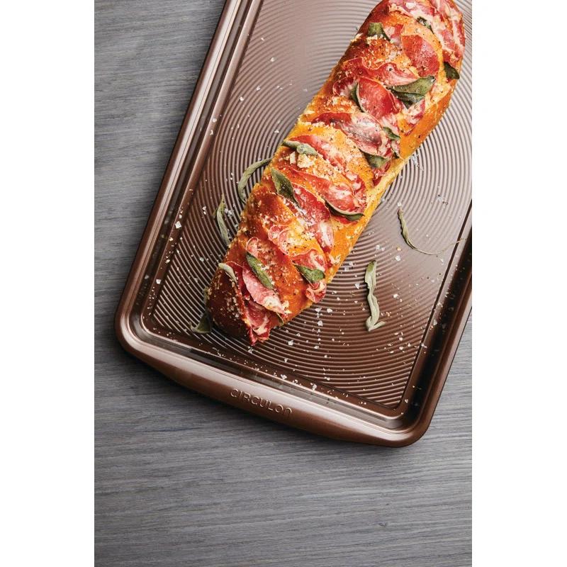 Satisfy that sweet tooth even as you bake healthier with the circulon bakeware 2-piece cookie pan set. This set includes a circulon bakeware cookie pan made of heavy gauge steel for proper heat distribution and maximum durability, with a medium chocolate color tone to promote beautiful browning. It also includes a handy, nonstick wire cooling rack. The pans feature the total food release system of circles with premium nonstick, which reduces surface abrasion from kitchen utensils. This high-quality nonstick promotes such efficient release of baked goods, there is no need to grease the pan before making a batch of cookies. Hand washing the cookie sheet and cooling rack is recommended. Oven safe to 450°F, the cookie sheet set is the ideal start to a complete circulon bakeware collection. Bake up batches of cookies and other favorite treats with the durable, easy-to-clean Circulon nonstick bakeware 2-piece cookie pan set with superior nonstick technology. This product contains (este producto contiene) PTFE (PFAS). For more information on PFAS or chemicals in this product, visit (para obtener mas informacion sobre pfas o productos quimicos en este producto, visite) circulon.Com/pages/product-disclosures.