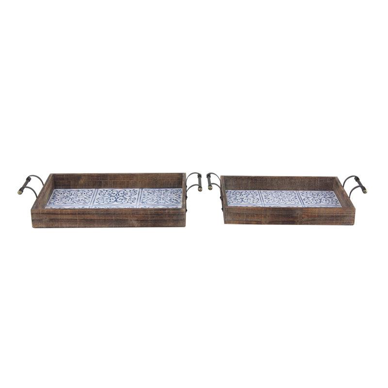 This 2-pierce of decorative trays adds a finishing rustic touch to your coffee table, sideboard, and dresser. Each is crafted from wood in a natural brown hue and a rectangular shape. The matching designs feature blue and white tile patterns at the bottom for a boho aesthetic. We love that they have metal arching handles and raised edges that make it easy to move from room to room. They measure 19'' wide and 23'' wide, respectively.