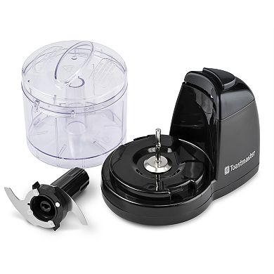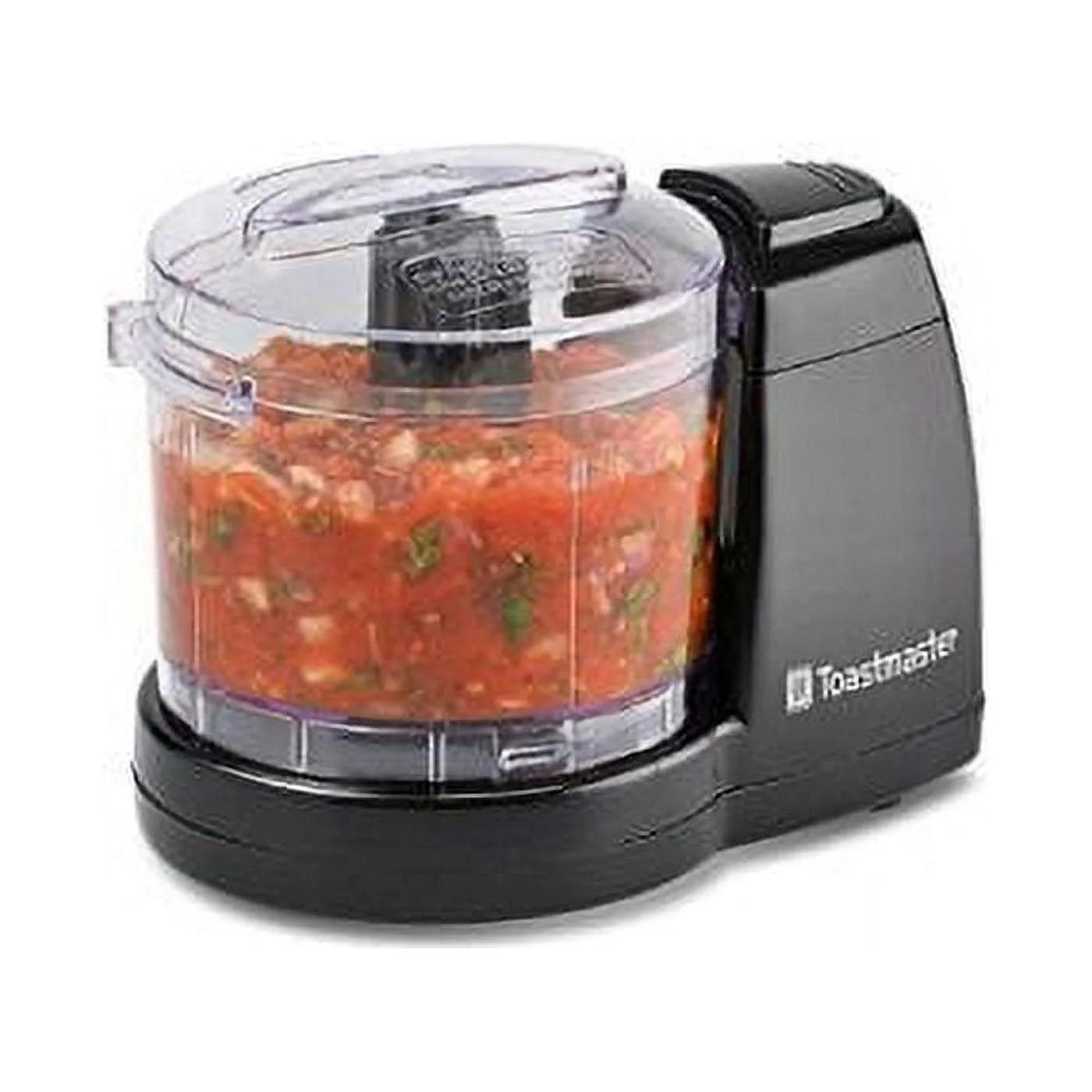 Chop, puree, dice and mince. Make quick work of the most time-consuming part of meal preparation with this mini chopper from Toastmaster. The simple and convenient one-touch operation easily dices and chops everything from salsa to minced garlic. The detachable bowl holds 1.5 cups while stainless steel blades easily chop fruits and vegetables. Safety features include a safe-locking lid and non-skid rubber feet. Condition - New.