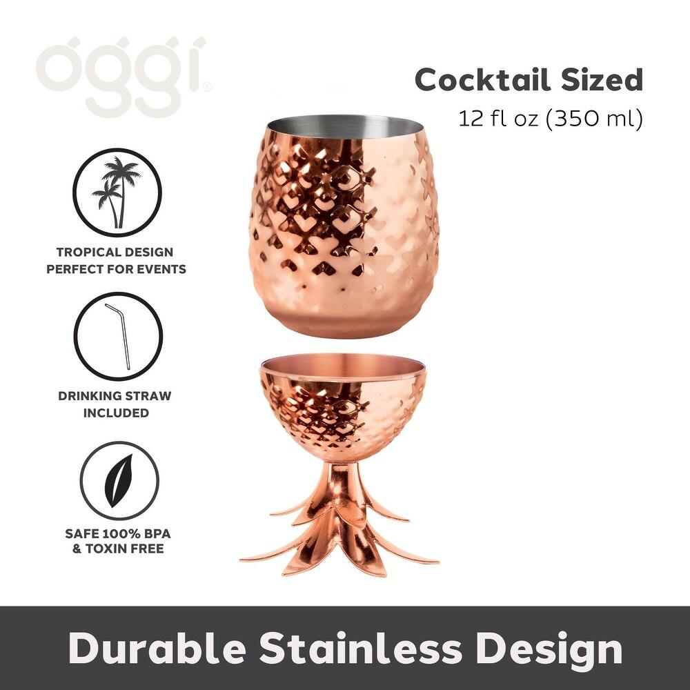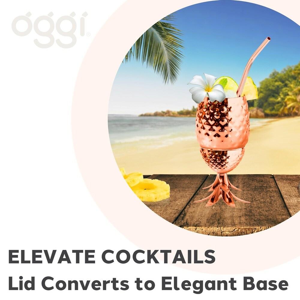 Let OGGI's Stainless Steel Pineapple Cup with Straw & Lid make you feel like you are on vacation with every use. Just add the sun and a luau to relax! This 12oz stainless steel cup is shaped like a pineapple with the lid as a crown. The high-quality food safe stainless steel pineapple cup is perfect for serving up tropical beverages with themed fashion and fun. Use tumbler instead of a margarita glass or moscow mule mug to elevate tradition cocktails and keep them cold. The pineapple cup is just as cute as it is functional. The durable stainless steel is copper plated giving it a sleek and lustrous look. The tumbler lid creates a secure base to rest your drink on and the included straw makes sipping easy. To ensure the best quality possible, it is recommended to hand wash this cup.