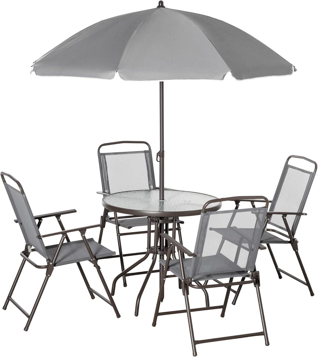 6 Piece Patio Dining Set for 4 with Umbrella, Outdoor Table and Chairs with 4 Folding Dining Chairs & Round Glass Table for Garden, Backyard and Poolside, Gray