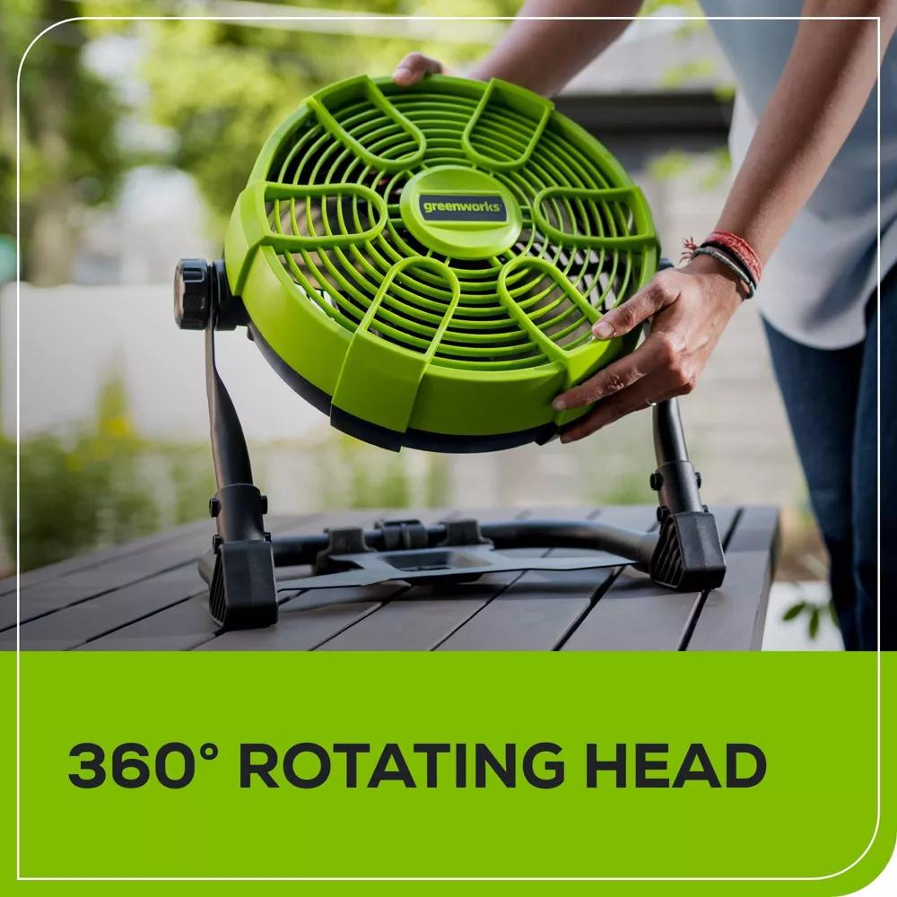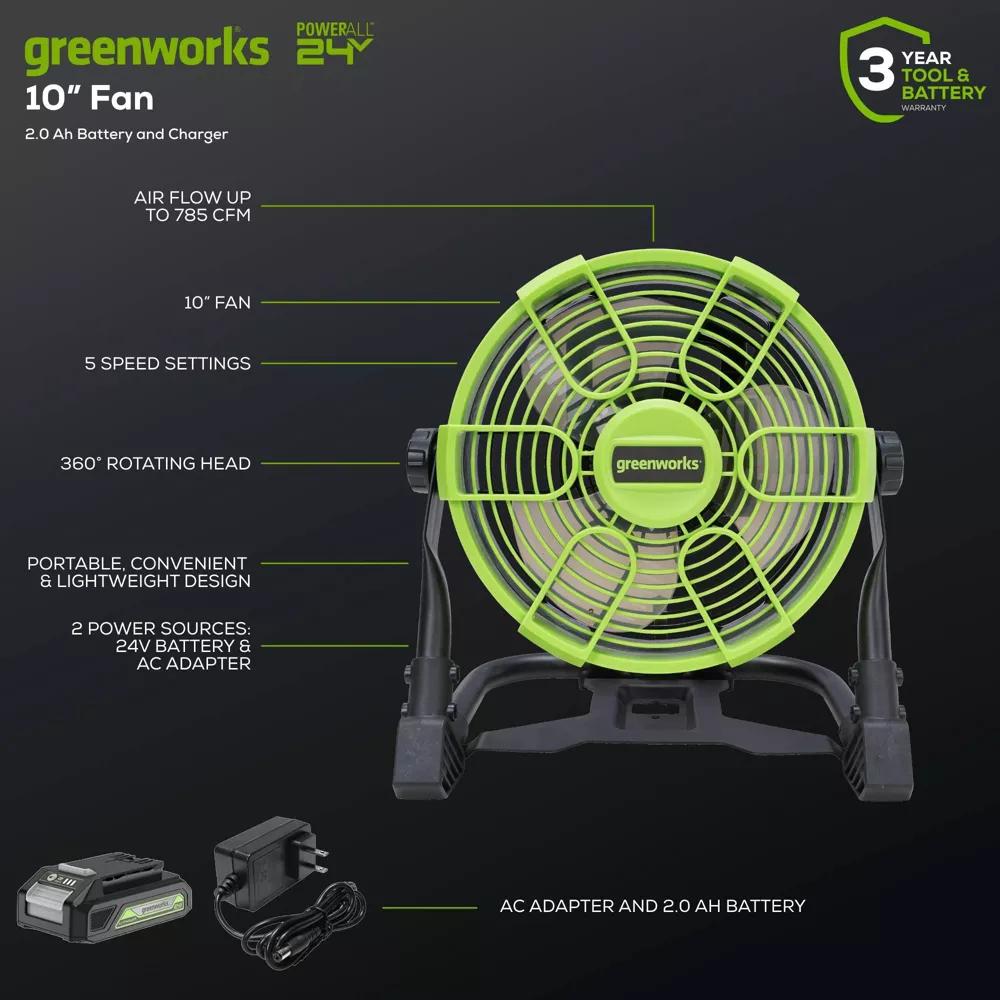 The Greenworks 10” Fan utilizes 24V DC / 120V AC Power that offers a hybrid power source to provide all day run-time in the garage, around the house, outdoors, or on-the-go! The Greenworks 24V Cordless Fan offers 5 variable speed settings so you can easily switch between high, medium and low fan settings for customizable air flow. The Greenworks Cordless Fan offers up to 16 hours of run time on low, and up to 4 hours of run time on high with the included 2.0 Ah Battery, allowing you to use this fan all day.This fan features a 360° Pivoting Head to direct airflow and allows for optimal control. This Tool is part of the Greenworks 24V PowerAll Family of over 125+ Cordless Indoor and Outdoor Products that all work on the same battery platform (Lawn & Garden, Indoor/Outdoor Cleaning, Power Tools, Lifestyle, Power Solutions and more)!