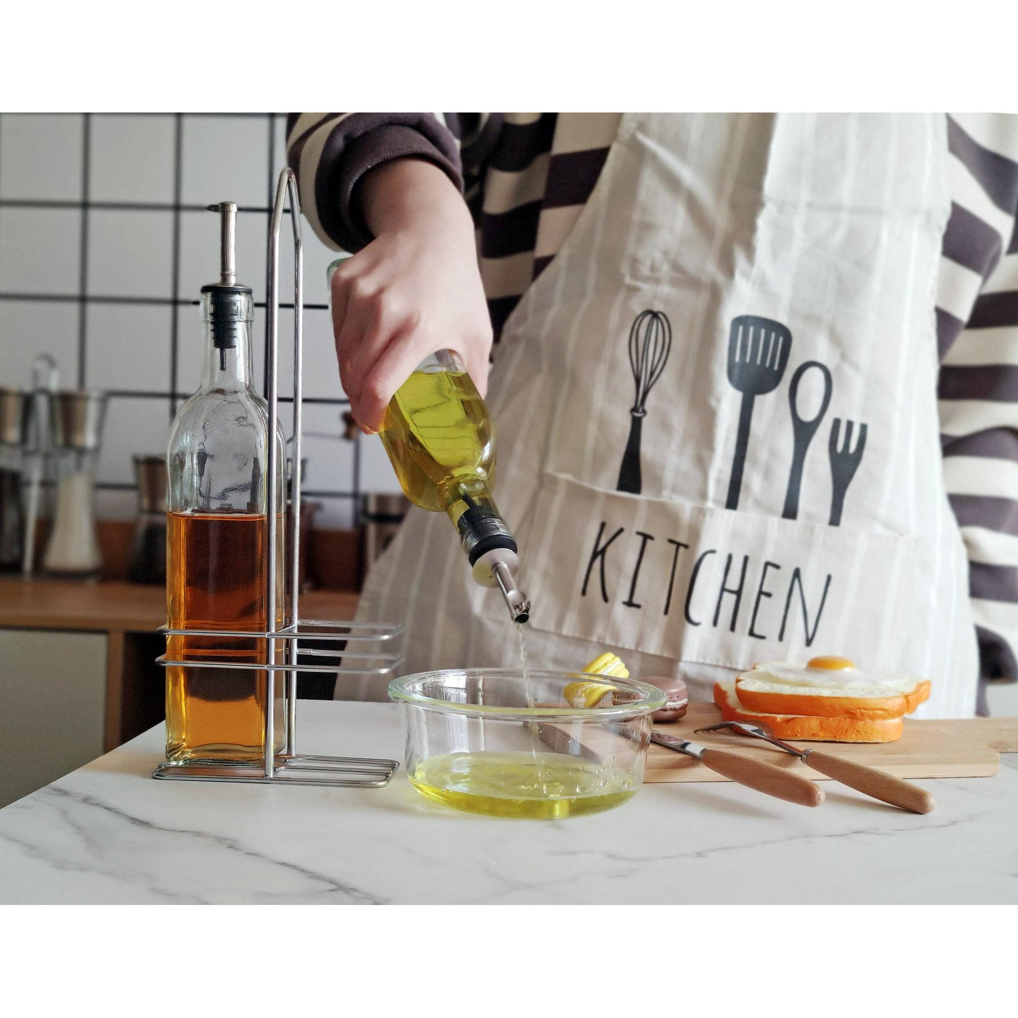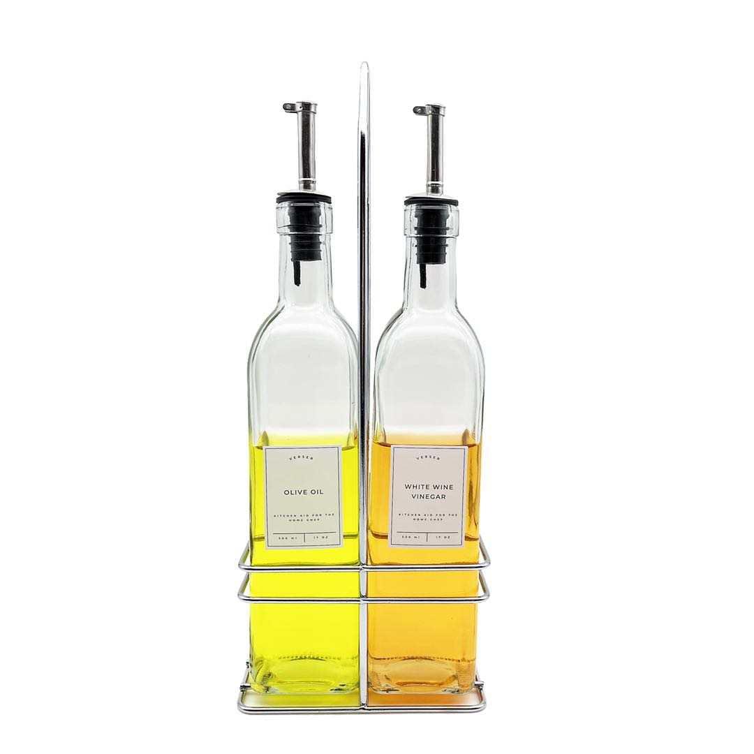Verser Oil And Vinegar Dispenser Set - Clear Glass Oil Bottle 17 oz with Stainless Steel Spout and Holding Rack, Oil Cruet for Kitchen - 2 Pack