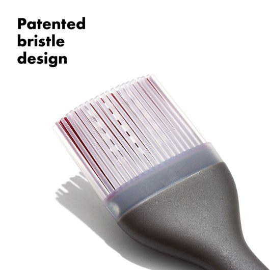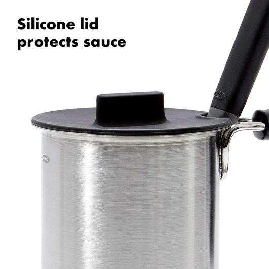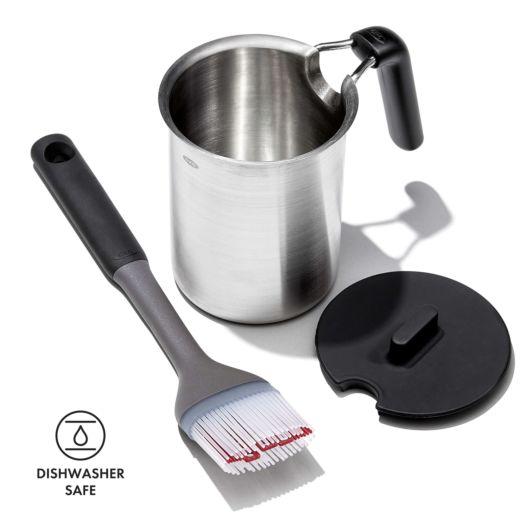 Ready for some seriously superior saucing? This stainless steel pot holds up to 18 ounces of marinade or barbecue sauce and features a silicone lid and a comfortable, non-slip handle. The basting brush has patented silicone bristles (which snag lots of sauce) and an angled head (for mess-free sauce application and keeping surfaces clean between swipes). Use this set for meats and veggies—on and off the grill. Dishwasher safe.