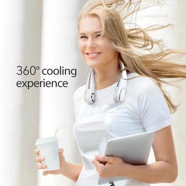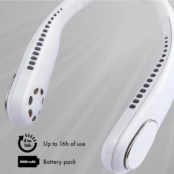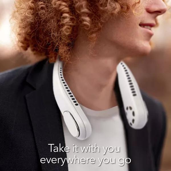 The HOM Portable Neck Fan has a sleek design and multiple functions. It's lightweight and extremely portable. This cooling fan is perfect for indoor and outdoor activities such as running, riding, camping, and hiking. Using a bladeless motor and a multilevel airflow to ensure low noise while operating, it makes life and work easier. Its 4000mAh battery can be used between 4 and 16 hours depending on the speed settings. Charging it with a computer, converter, or power bank is simple and easy.