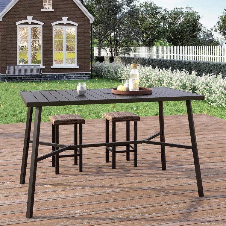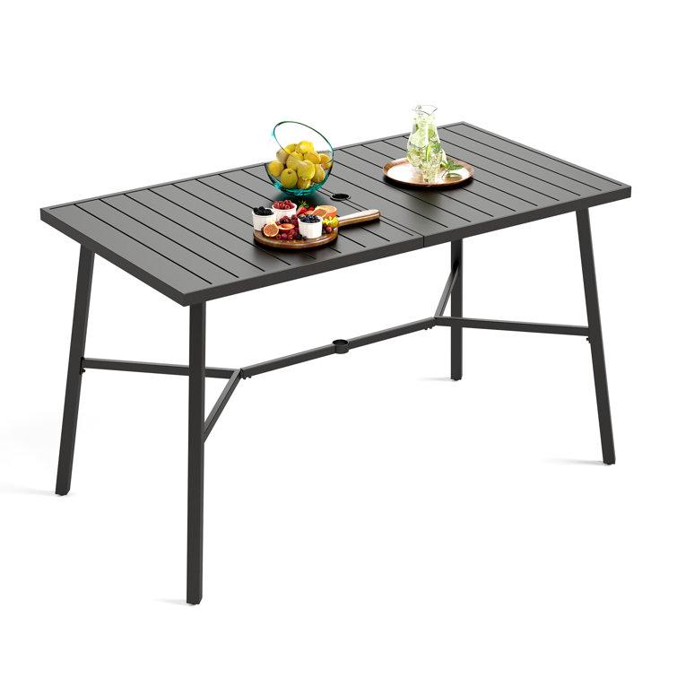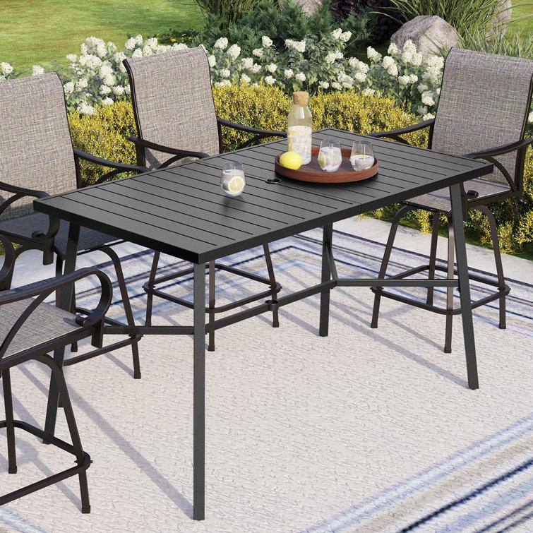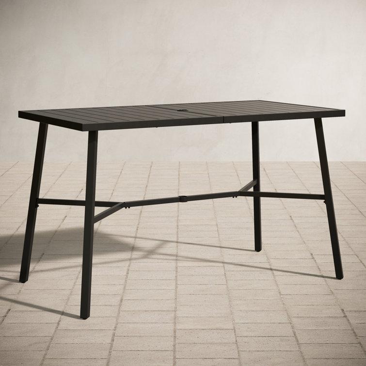 This classic outdoor bar table is an ideal spot for gathering with friends and enjoying al fresco meals. Made from powder-coated steel, this rectangular table features a black finish that complements any patio decor. Its weather-, water-, and UV-resistant design ensures it will withstand the elements, while also being fire-resistant and anti-bacterial. The table comfortably seats four, and its 41'' high and 66'' long dimensions provide ample space for dining and entertaining. Best of all, it comes with a hole for an umbrella of your choice (sold separately).