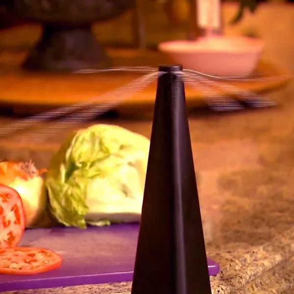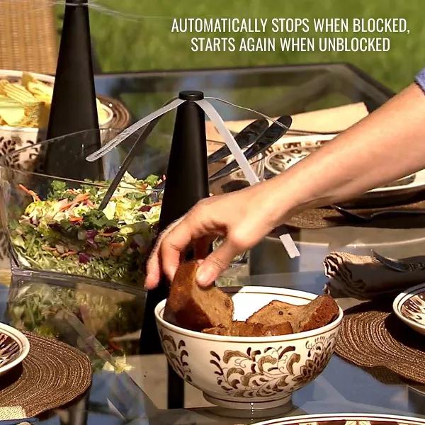 The Bernini Table Guard Fly Fan is a safe and natural way to keep flies away without the need for harmful chemicals. Perfect for backyard barbecues and get-togethers, this battery-powered device spins like a propeller, creating an area that flies don’t want to go near. The soft fan blades have sensors that stop the rotation if they come into contact with anything, so they are safe to have near your hands, starting automatically when the blockage is removed. The Table Guard has a 4-hour automatic shut-off timer, so you don’t need to worry about wasting battery life by forgetting to turn it off. Requires two AA batteries, not included. Measures 10” tall x 16” in diameter (with fan blades extended) and weighs 1.1 lbs.