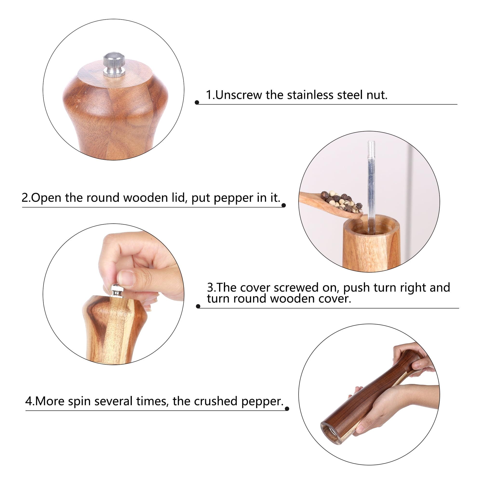 Mutiple use. Can grind pepper and salt, or other spices by yourself. Health and environmental protection. Easily and convenient operation. As a kitchen or table furnishing, it adds the joy to your life.