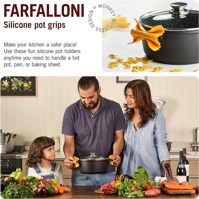 BIG BUTTERFLY GRIPS TO HOLD YOUR HOT POTS WITH! This pot holder pair is an amazingly simple kitchen gadget that will nonetheless save the day in your kitchen. When you need to, say, take a French oven off the stove and put it proudly on the dinner table for it to be the centerpiece of the family meal, potholders are indispensable. Plus, these silicone pot holders shaped like farfalloni (big-butterflies pasta) are so much more fun than plain oven mitts: surprise your guests! Disclosure: We are a participant in the Amazon Services LLC Associates Program, an affiliate advertising program designed to provide a means for us to earn fees by linking to Amazon.com and Affiliate sites.