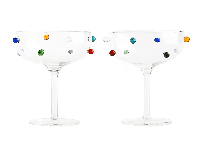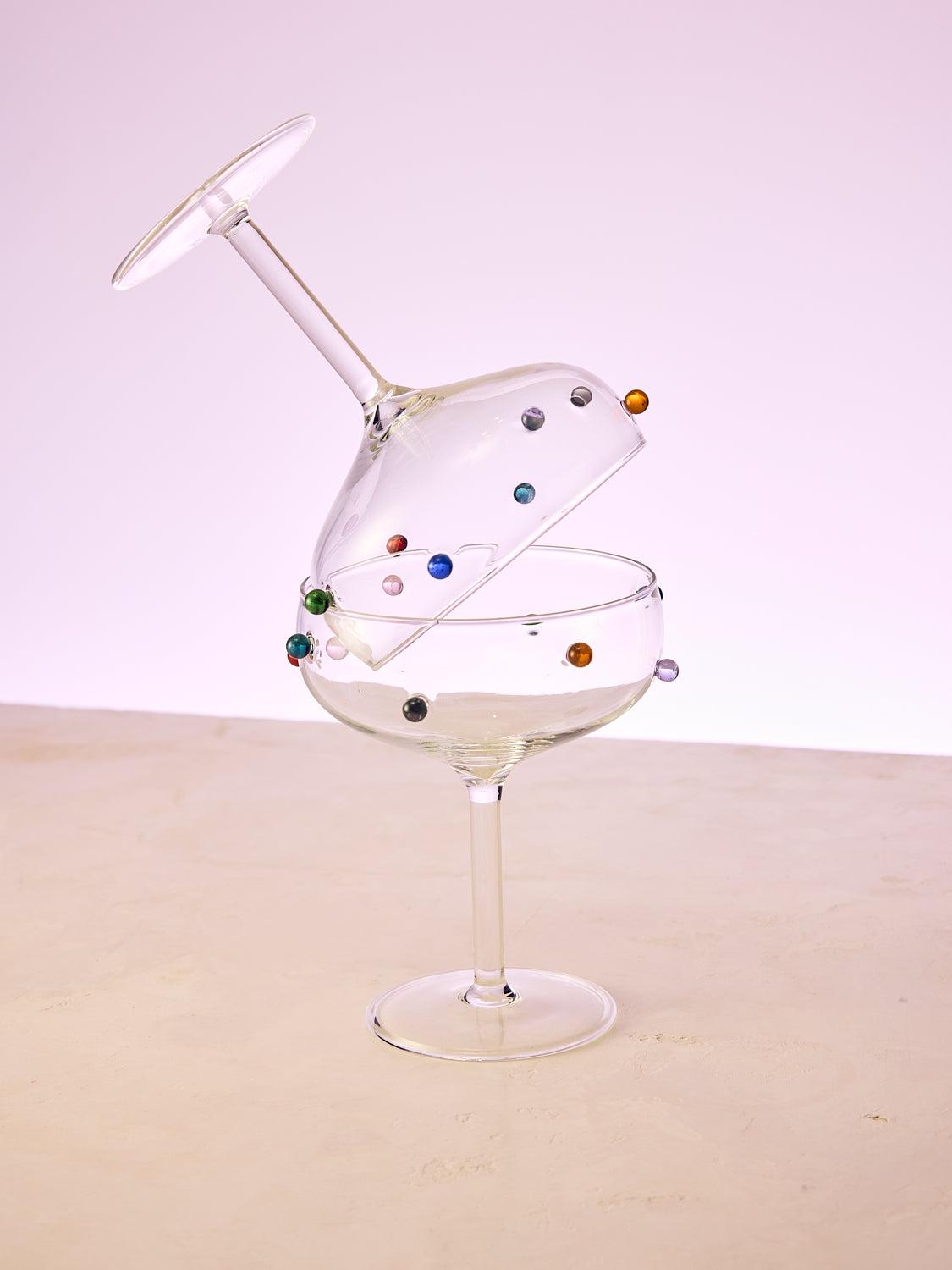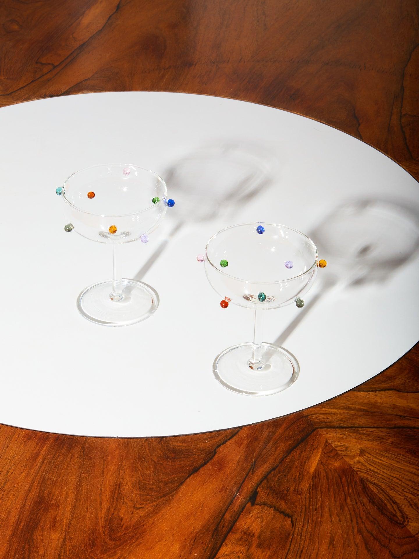 Introducing the Pomponette champagne coupes, a playful set of handmade glasses decorated with jeweled multicolored bubbles. Invite the Pomponette duo to all of your celebrations, they make the most satisfying clink.