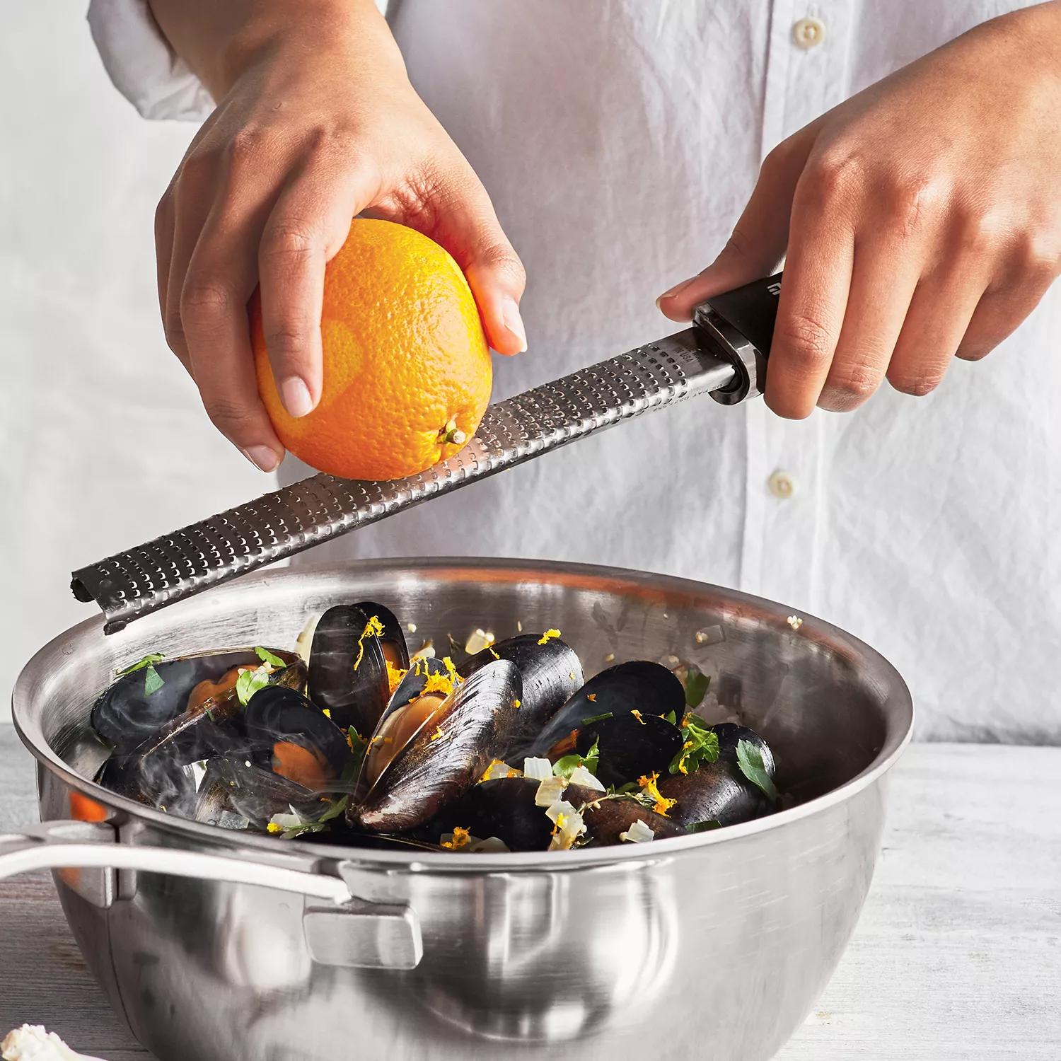 With razor-sharp edges and comfortable grips, thus soft-handle grater creates flakes of hard cheese, chocolate and zest. Top salads and pastas with Parmesan Reggiano or add natural flavors to lemon crème brûlée or vinaigrette. Stainless steel plane grates fine, lacy wisps from even the hardest cheeses. Soft-touch handle eases fatigue.